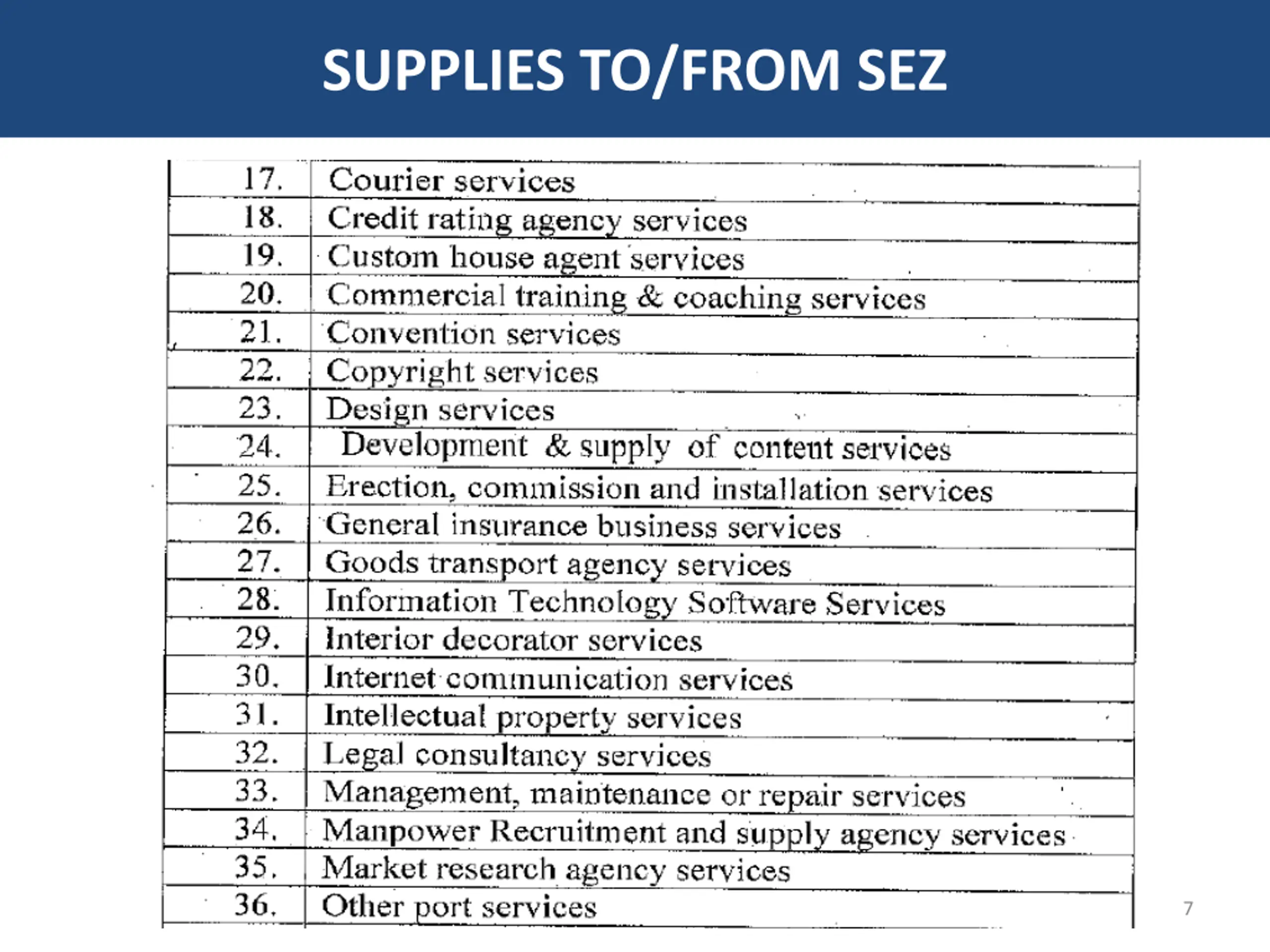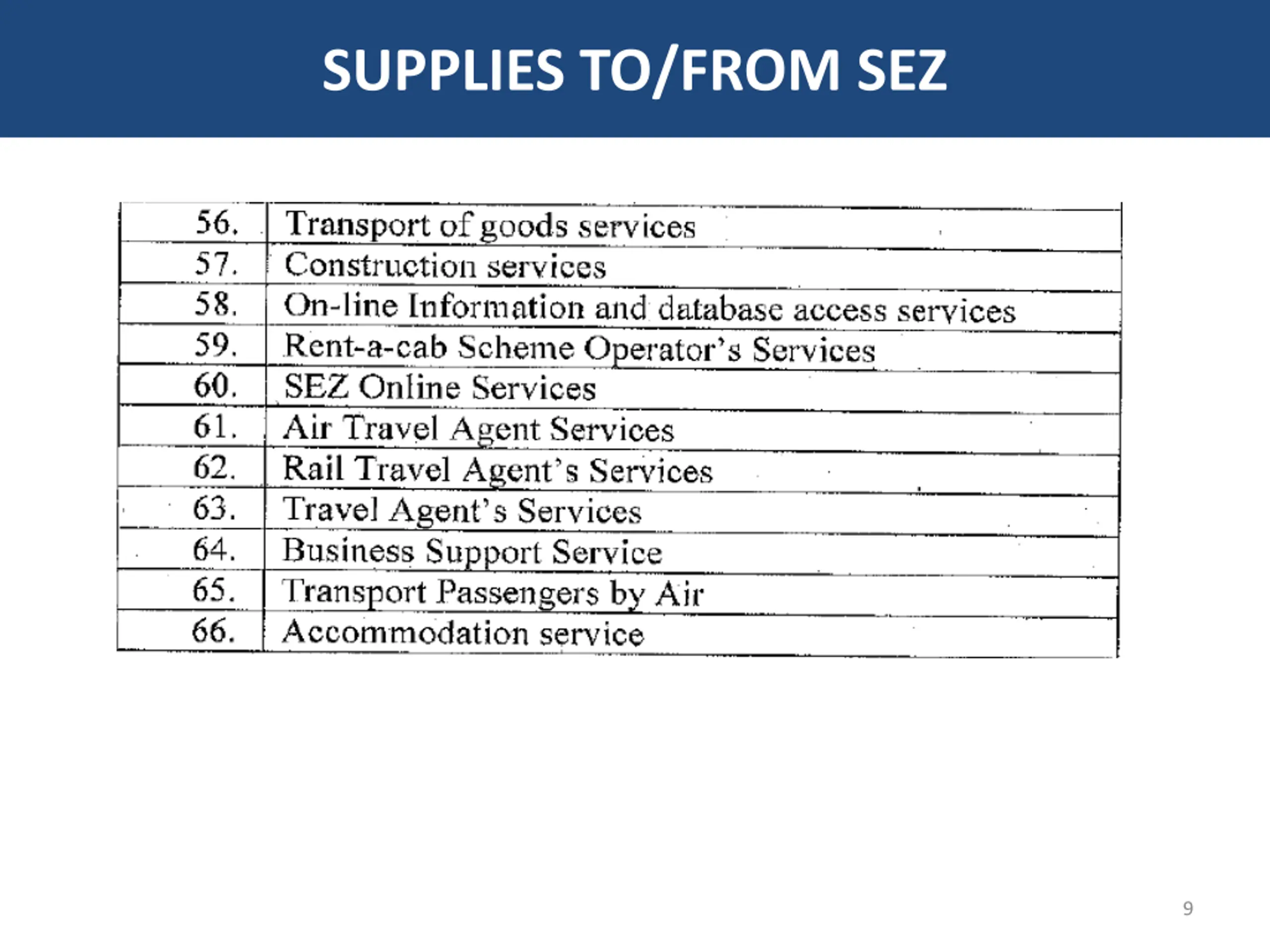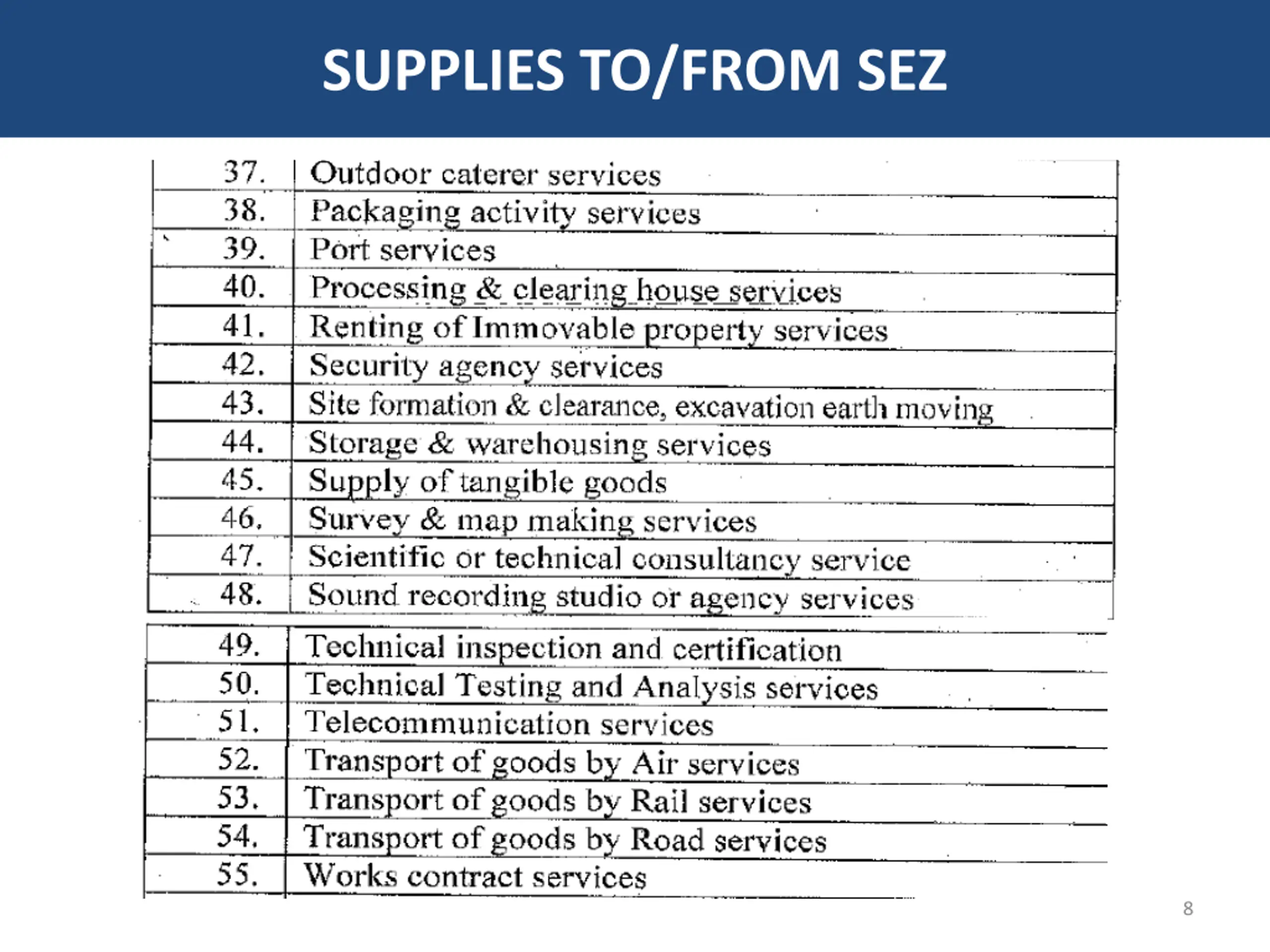 Supplies TO/FROM SEZ DTA supplies Goods and Services to SEZ Shall be considered as inter-state supply and zero rated supply Supplier eligible for export benefits under Foreign Trade Policy Supplier in DTA can supply after payment of IGST (and claim refund of IGST) or against LuT {and claim refund of ITC if supplied for authorized operations [Rule 89(1)]} Ministry of Commerce (SEZ Section) has notified 66 services as default authorized services vide F.No.D.12/19/2013-SEZ dt. 2.1.2018 Where service is taxable & subject to RCM - SEZ Recipient is liable?? Procurement of Goods (Import) from Outside India by SEZ Shall be considered as import Import for authorized operations - Exempt vide Notification No. 64/2017-Cus 3