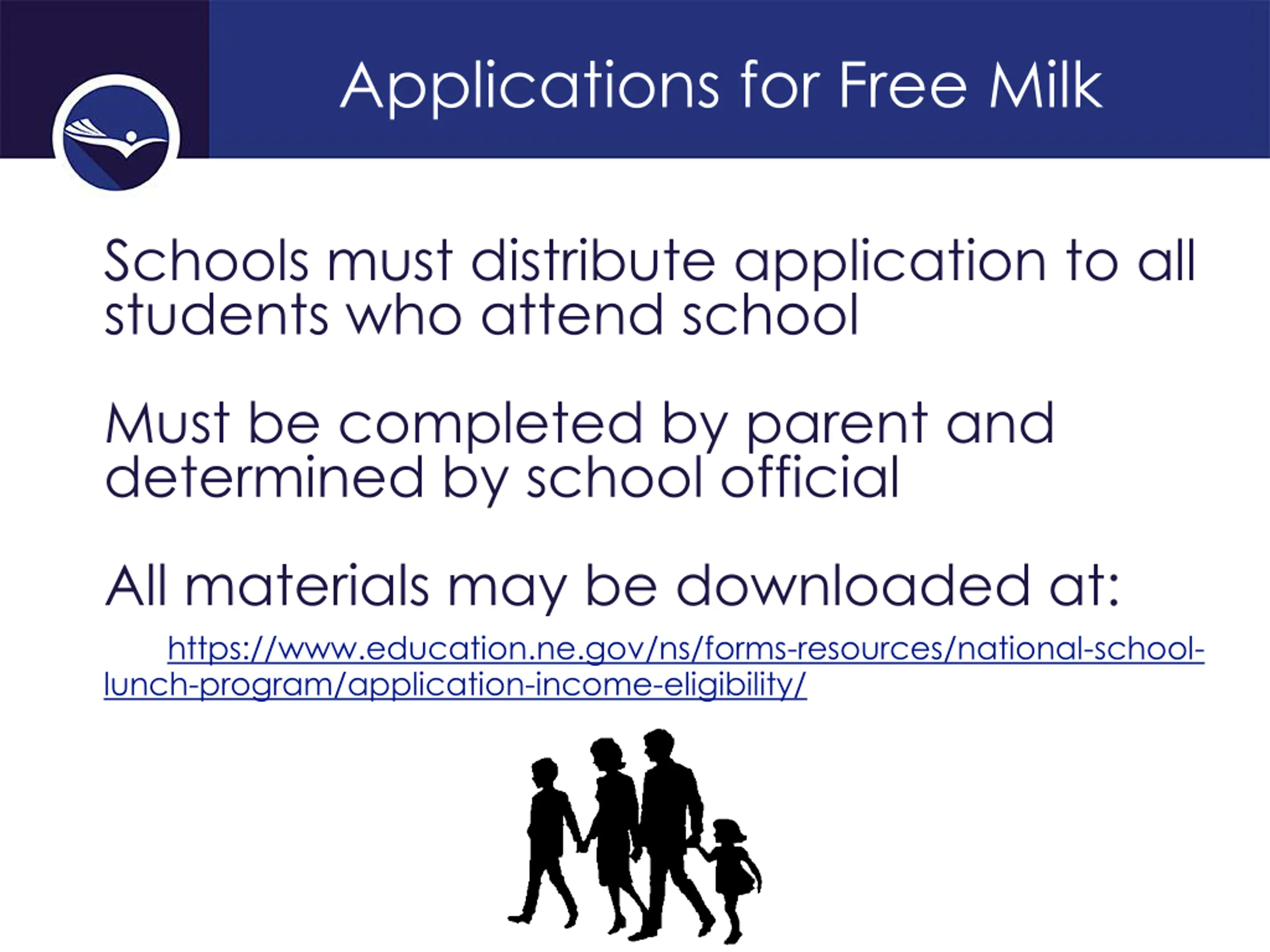 Applications for Free Milk Schools must distribute application to all students who attend school Must be completed by parent and determined by school official All materials may be downloaded at: https://www.education.ne.gov/ns/forms-resources/national-school- lunch-program/application-income-eligibility/