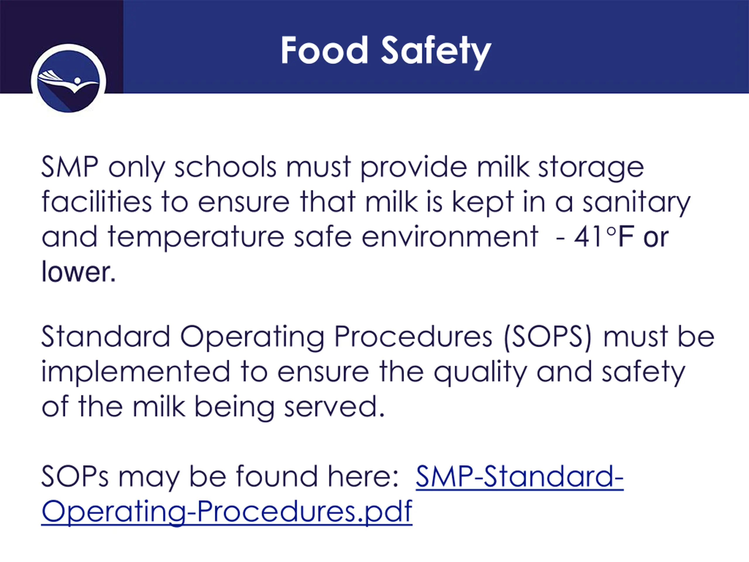 Food Safety and temperature safe environment - 41 F or lower. SMP only schools must provide milk storage facilities to ensure that milk is kept in a sanitary Standard Operating Procedures (SOPS) must be implemented to ensure the quality and safety of the milk being served. SOPs may be found here: SMP-Standard- Operating-Procedures.pdf
