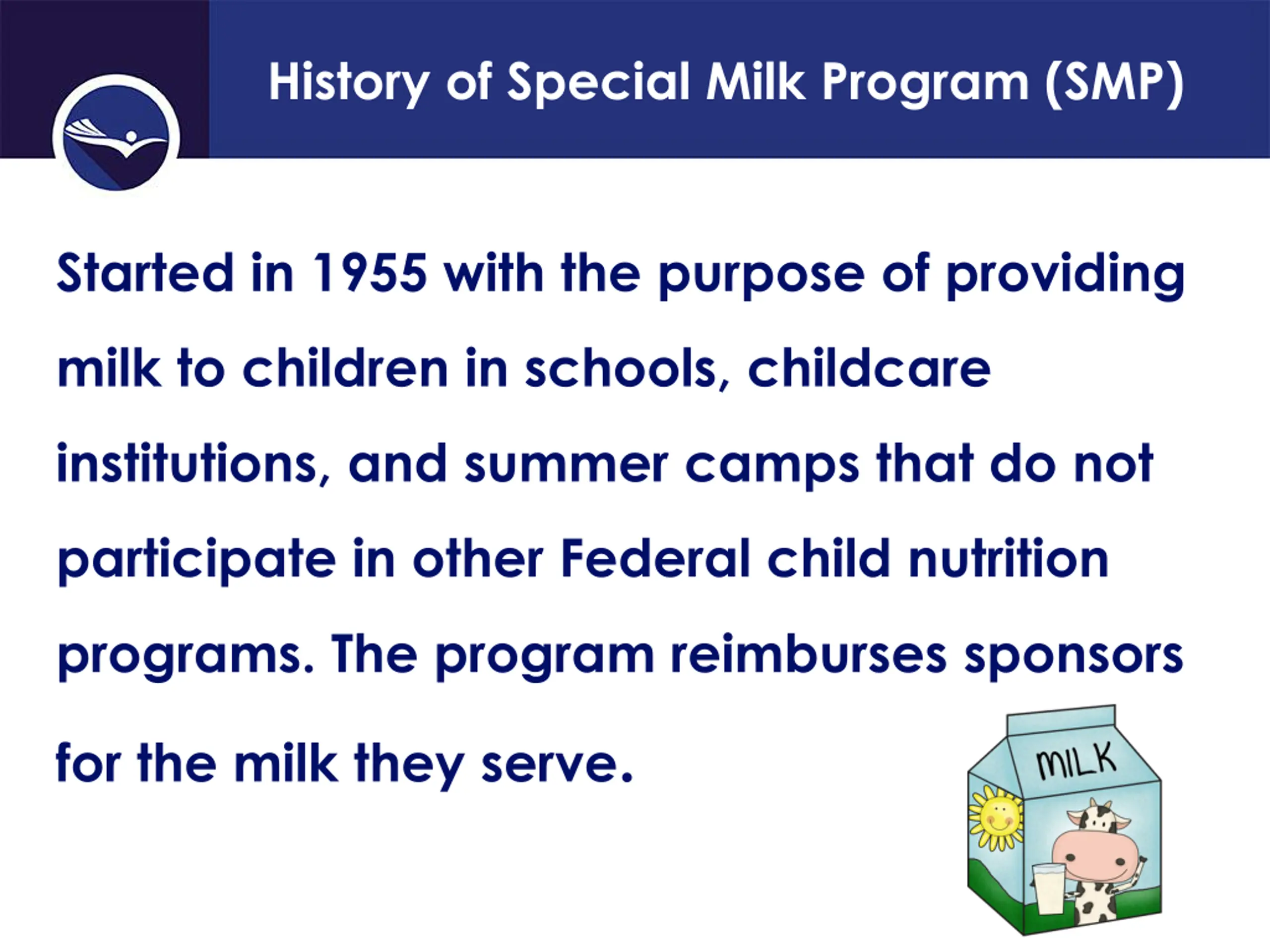 History of Special Milk Program (SMP) Started in 1955 with the purpose of providing milk to children in schools, childcare institutions, and summer camps that do not participate in other Federal child nutrition programs. The program reimburses sponsors for the milk they serve.