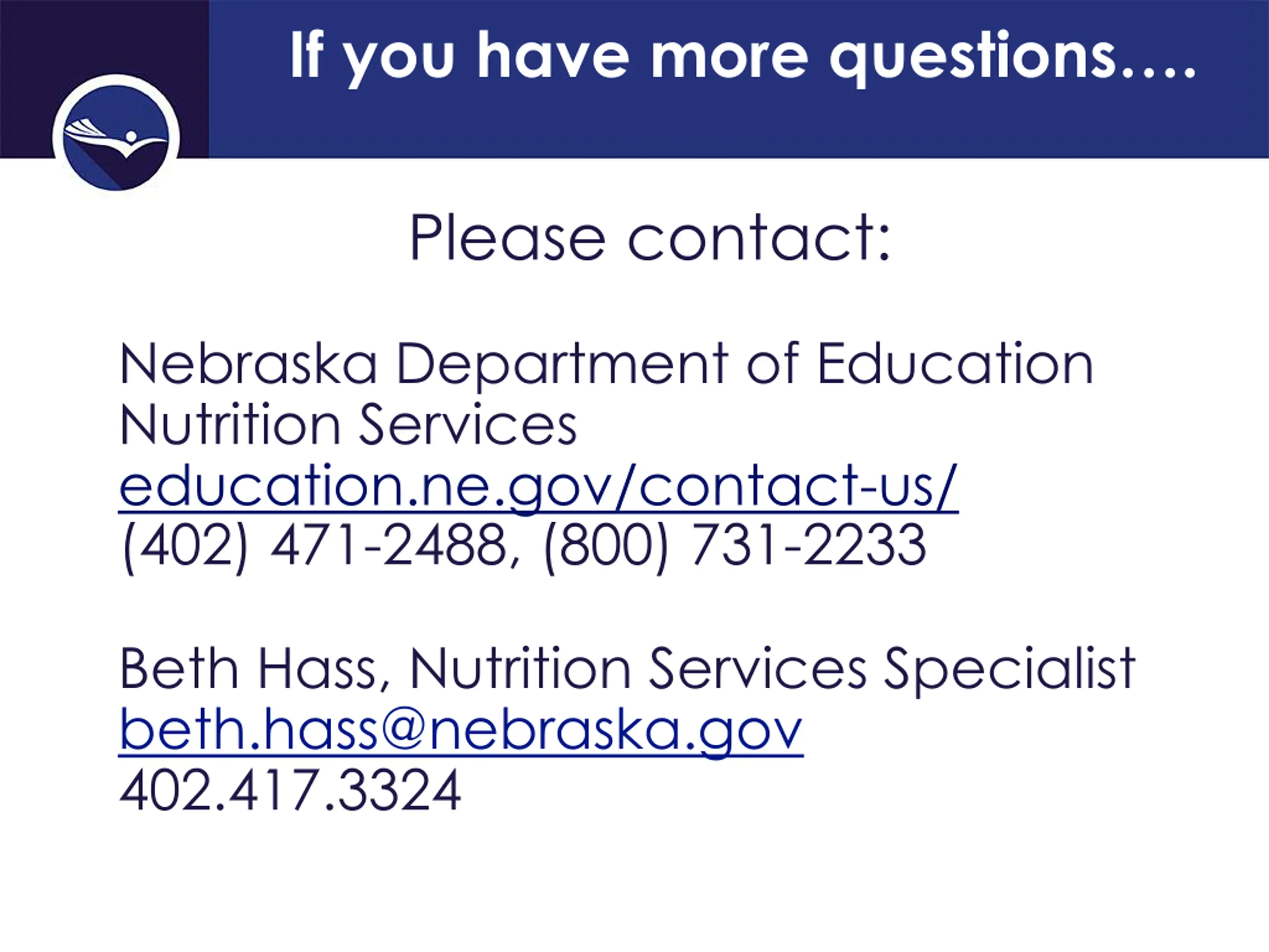 If you have more questions. Please contact: Nebraska Department of Education Nutrition Services education.ne.gov/contact-us/ (402) 471-2488, (800) 731-2233 Beth Hass, Nutrition Services Specialist beth.hass@nebraska.gov 402.417.3324
