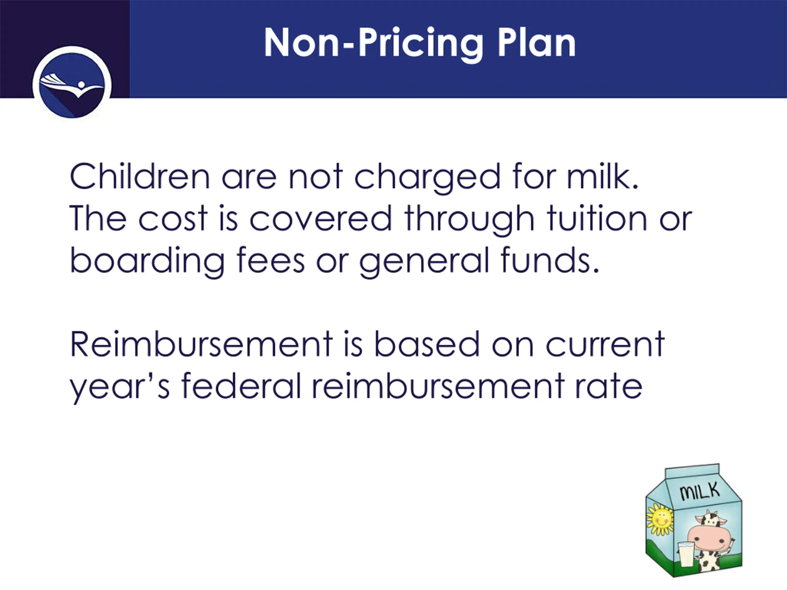 Non-Pricing Plan Children are not charged for milk. The cost is covered through tuition or boarding fees or general funds. Reimbursement is based on current year s federal reimbursement rate
