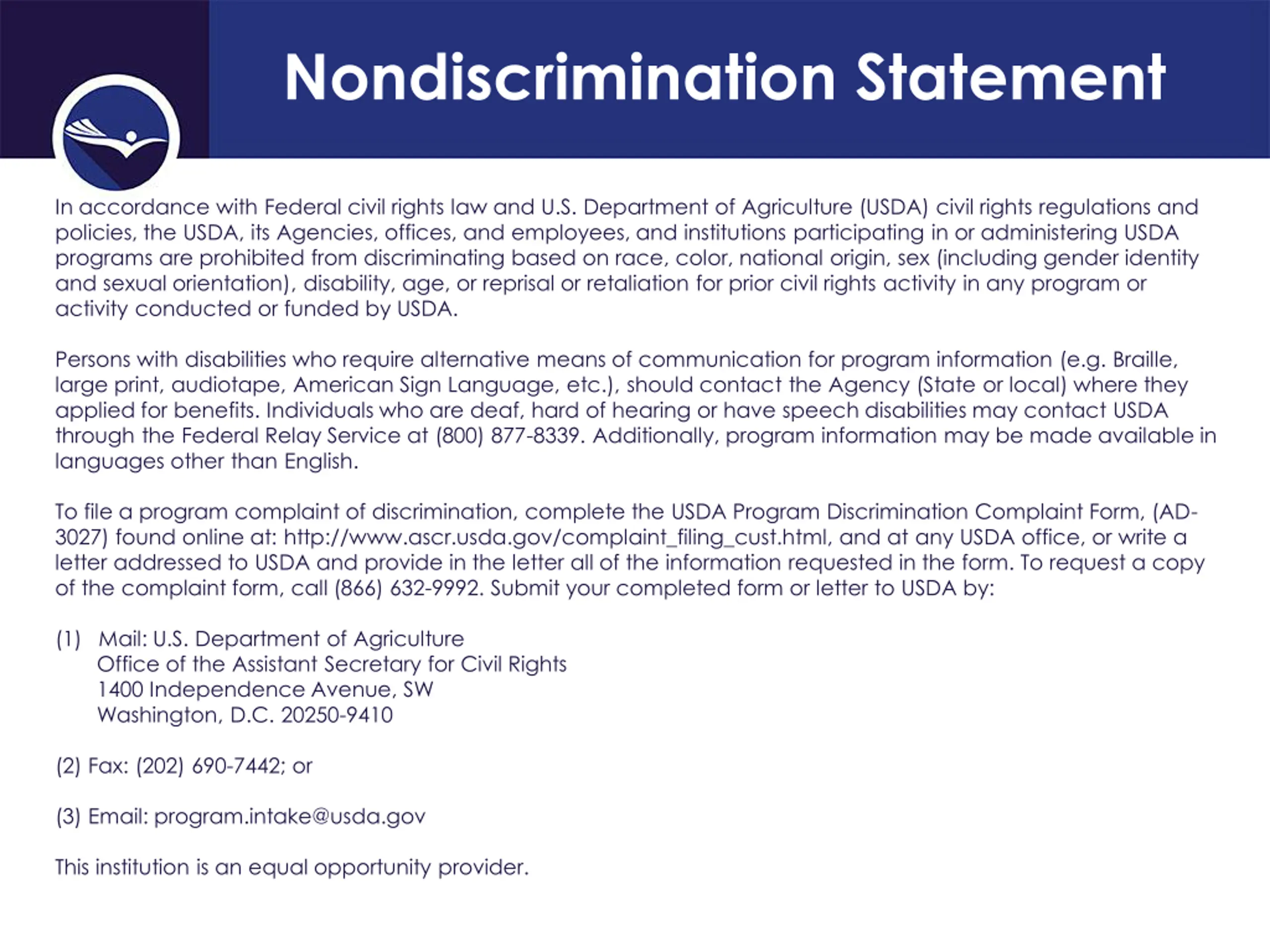 Nondiscrimination Statement In accordance with Federal civil rights law and U.S. Department of Agriculture (USDA) civil rights regulations and policies, the USDA, its Agencies, offices, and employees, and institutions participating in or administering USDA programs are prohibited from discriminating based on race, color, national origin, sex (including gender identity and sexual orientation), disability, age, or reprisal or retaliation for prior civil rights activity in any program or activity conducted or funded by USDA. large print, audiotape, American Sign Language, etc.), should contact the Agency (State or local) where they applied for benefits. Individuals who are deaf, hard of hearing or have speech disabilities may contact USDA through the Federal Relay Service at (800) 877-8339. Additionally, program information may be made available in languages other than English. Persons with disabilities who require alternative means of communication for program information (e.g. Braille, To file a program complaint of discrimination, complete the USDA Program Discrimination Complaint Form, (AD- 3027) found online at: http://www.ascr.usda.gov/complaint_filing_cust.html, and at any USDA office, or write a letter addressed to USDA and provide in the letter all of the information requested in the form. To request a copy of the complaint form, call (866) 632-9992. Submit your completed form or letter to USDA by: (1) Mail: U.S. Department of Agriculture Office of the Assistant Secretary for Civil Rights 1400 Independence Avenue, SW Washington, D.C. 20250-9410 (2) Fax: (202) 690-7442; or (3) Email: program.intake@usda.gov This institution is an equal opportunity provider.