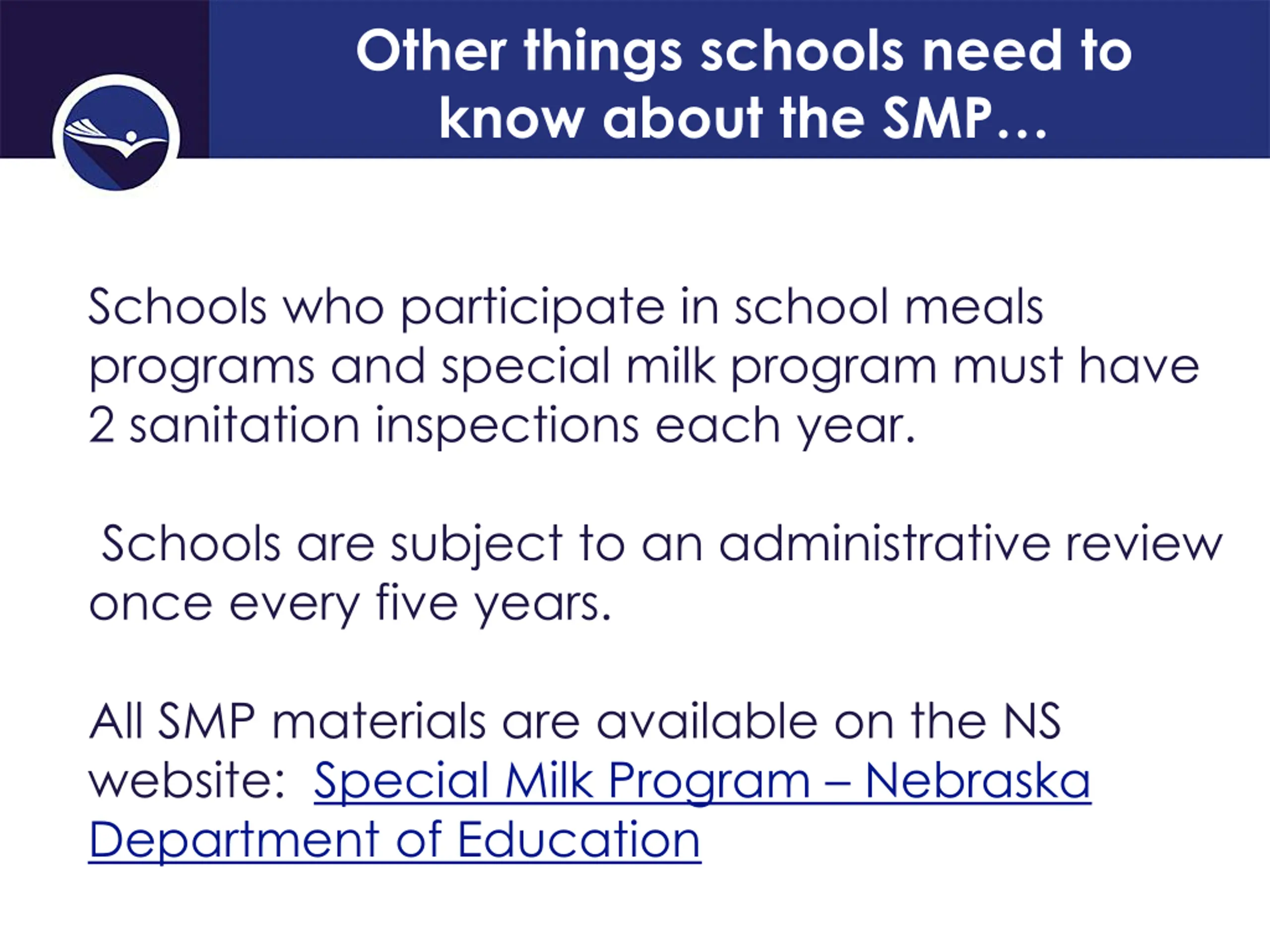 Other things schools need to know about the SMP programs and special milk program must have 2 sanitation inspections each year. Schools who participate in school meals Schools are subject to an administrative review once every five years. All SMP materials are available on the NS website: Special Milk Program Nebraska Department of Education