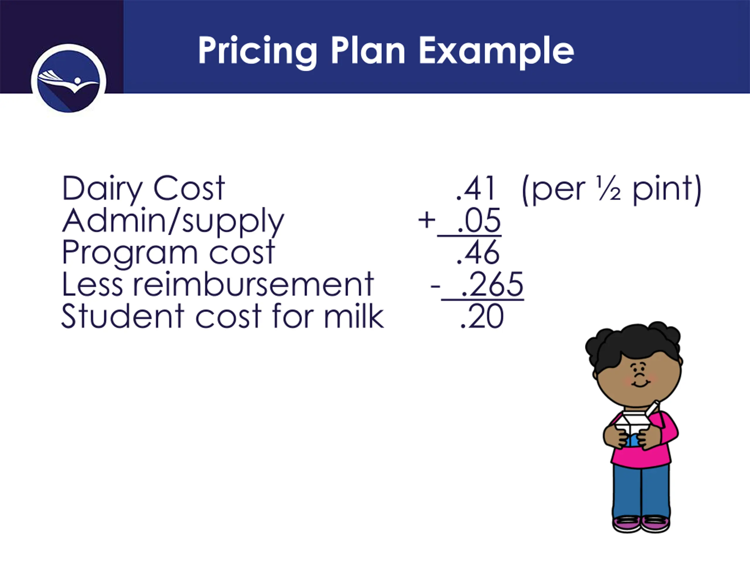 Pricing Plan Example Dairy Cost .41 (per pint) Admin/supply + .05 Program cost .46 Less reimbursement - .265 Student cost for milk .20