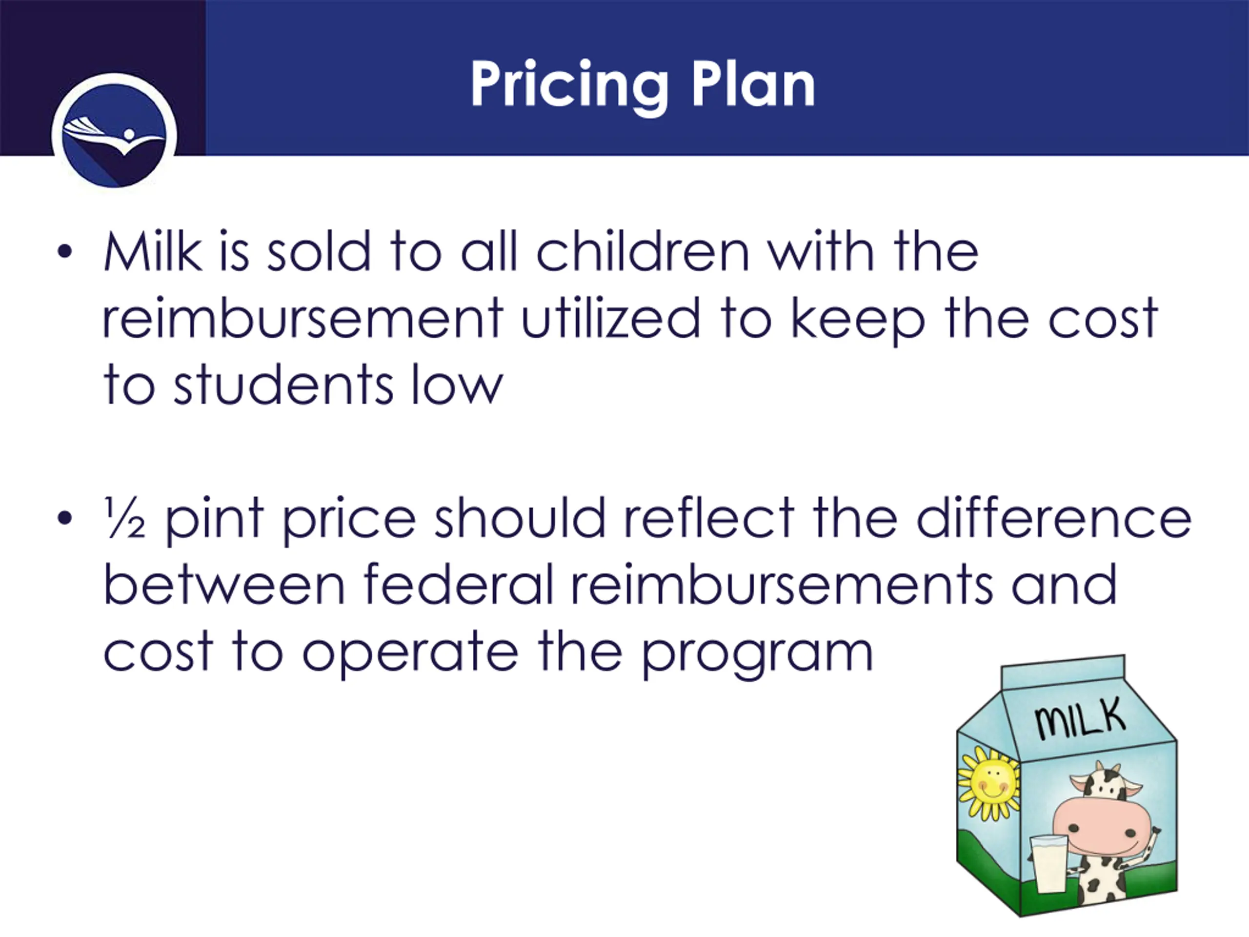 Pricing Plan Milk is sold to all children with the reimbursement utilized to keep the cost to students low pint price should reflect the difference between federal reimbursements and cost to operate the program