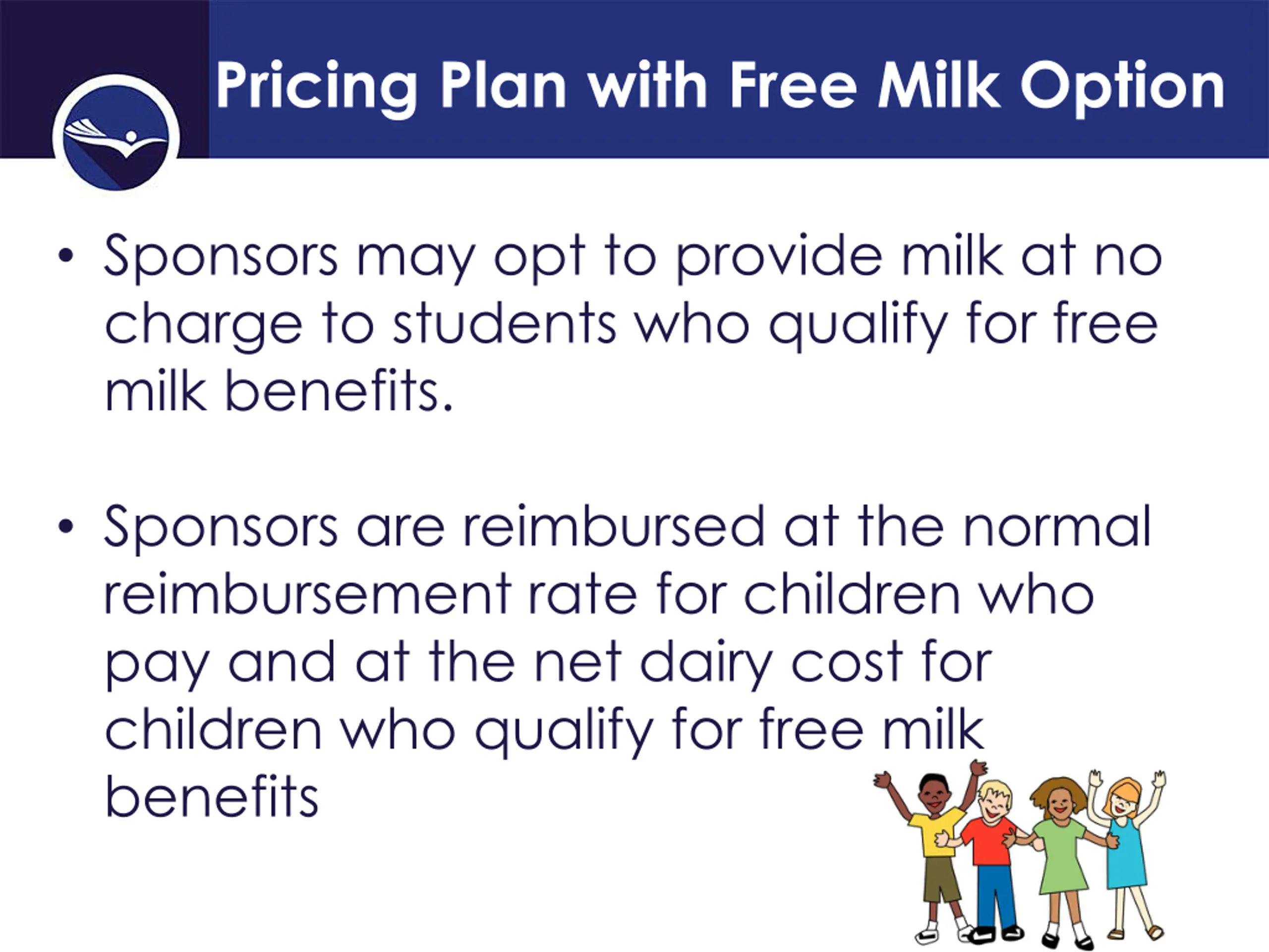 Pricing Plan with Free Milk Option Sponsors may opt to provide milk at no charge to students who qualify for free milk benefits. Sponsors are reimbursed at the normal reimbursement rate for children who pay and at the net dairy cost for children who qualify for free milk benefits