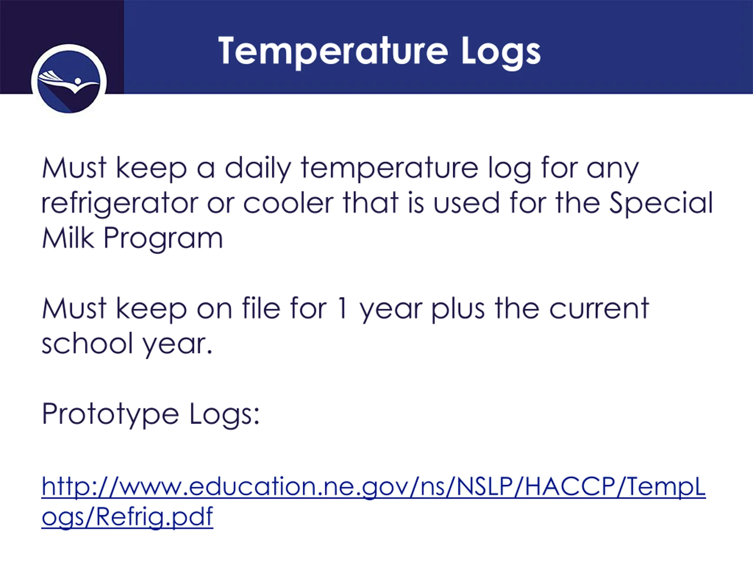 Temperature Logs Milk Program Must keep a daily temperature log for any refrigerator or cooler that is used for the Special Must keep on file for 1 year plus the current school year. Prototype Logs: http://www.education.ne.gov/ns/NSLP/HACCP/TempL ogs/Refrig.pdf