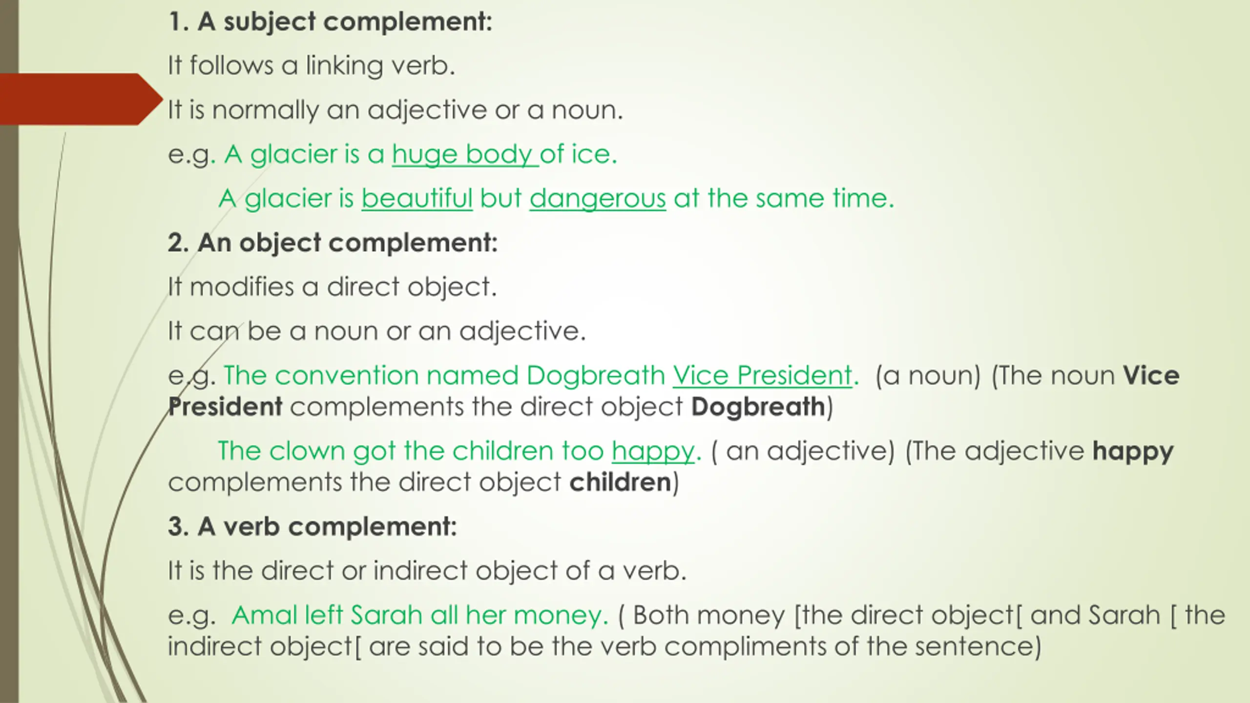1. A subject complement: It follows a linking verb. It is normally an adjective or a noun. e.g. A glacier is a huge body of ice. A glacier is beautiful but dangerous at the same time. 2. An object complement: It modifies a direct object. It can be a noun or an adjective. e.g. The convention named Dogbreath Vice President. (a noun) (The noun Vice President complements the direct object Dogbreath) The clown got the children too happy. ( an adjective) (The adjective happy complements the direct object children) 3. A verb complement: It is the direct or indirect object of a verb. e.g. Amal left Sarah all her money. ( Both money [the direct object[ and Sarah [ the indirect object[ are said to be the verb compliments of the sentence)