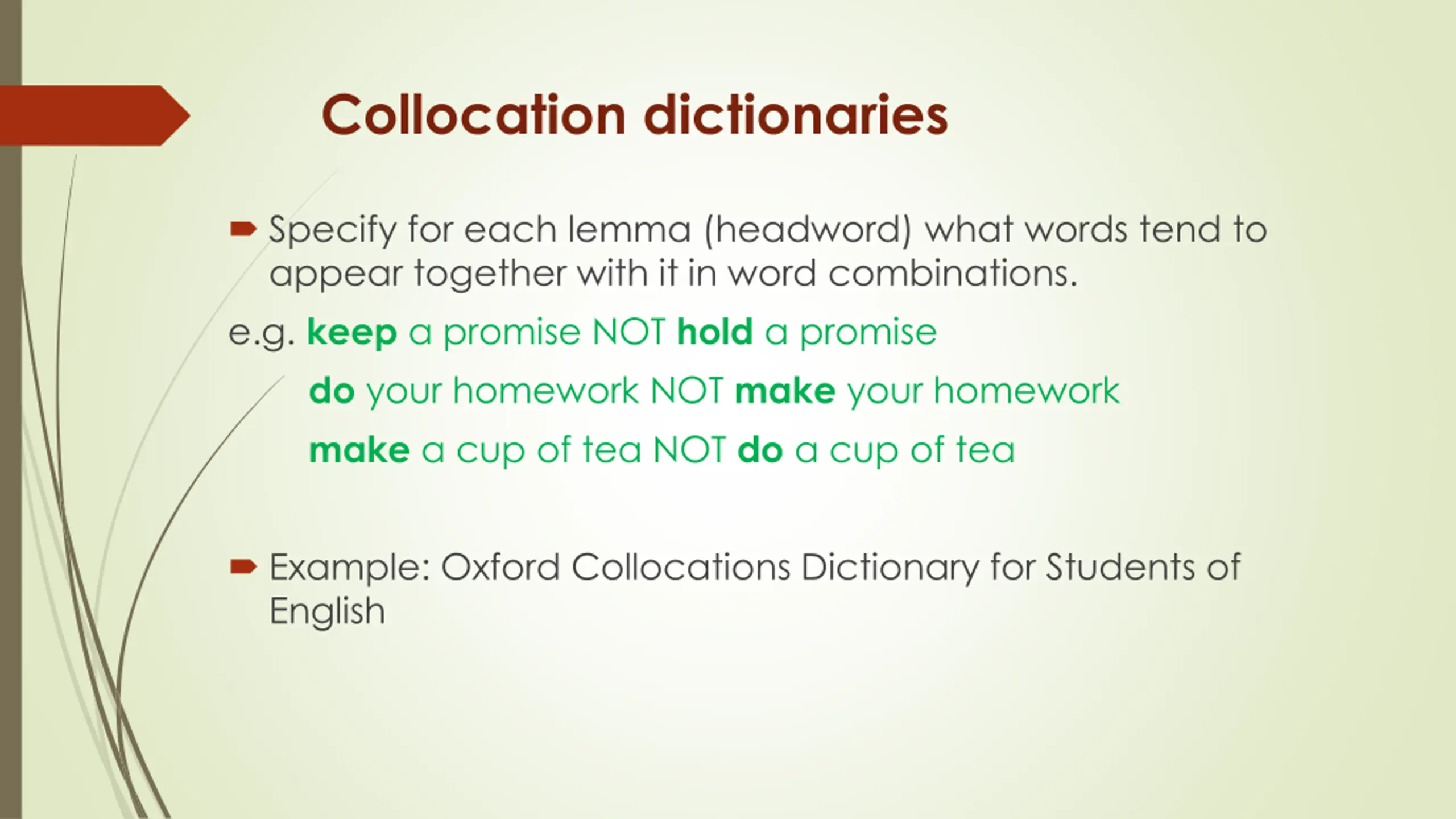 Collocation dictionaries Specify for each lemma (headword) what words tend to appear together with it in word combinations. e.g. keep a promise NOT hold a promise do your homework NOT make your homework make a cup of tea NOT do a cup of tea Example: Oxford Collocations Dictionary for Students of English