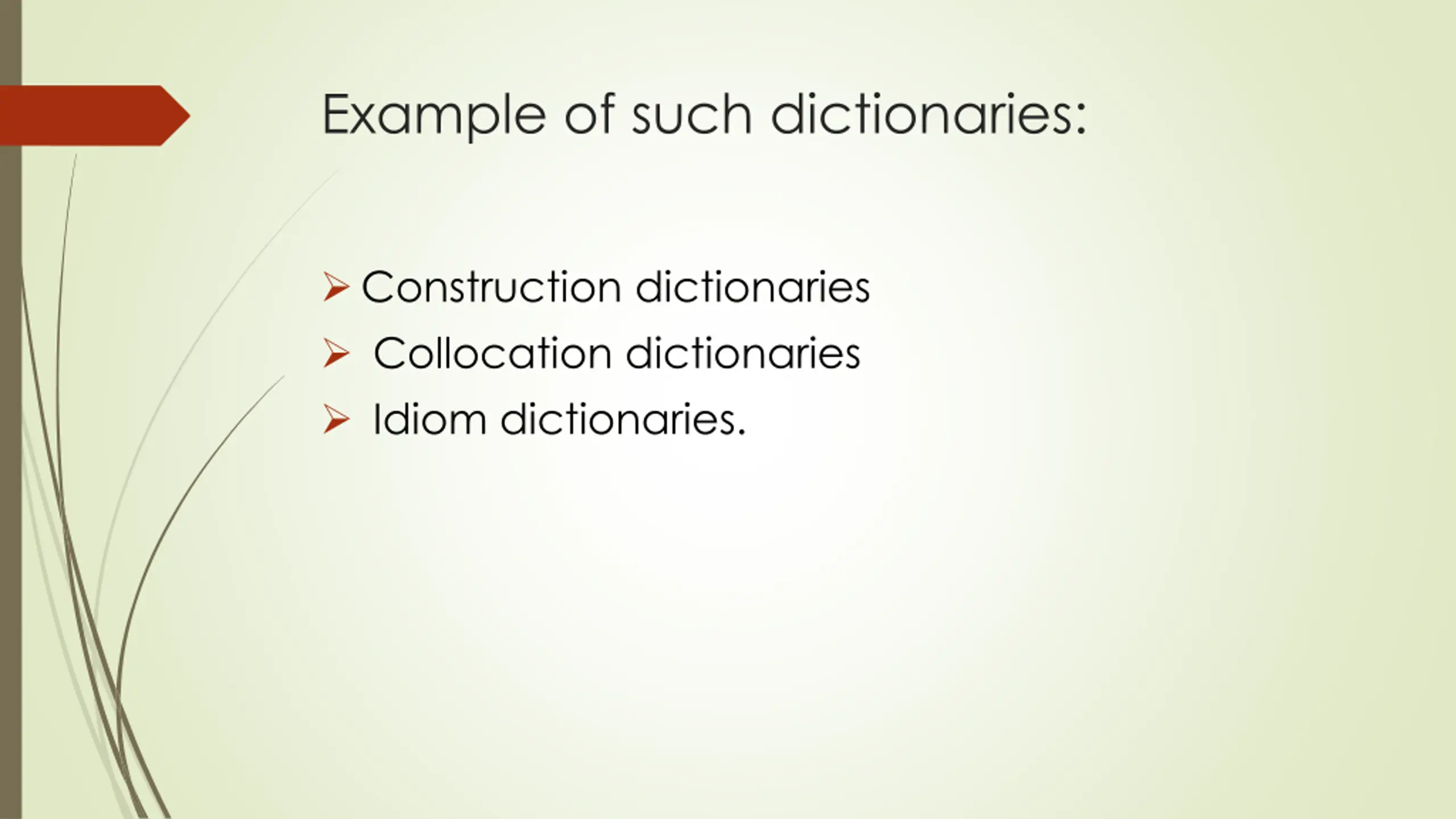 Example of such dictionaries: Construction dictionaries Collocation dictionaries Idiom dictionaries.