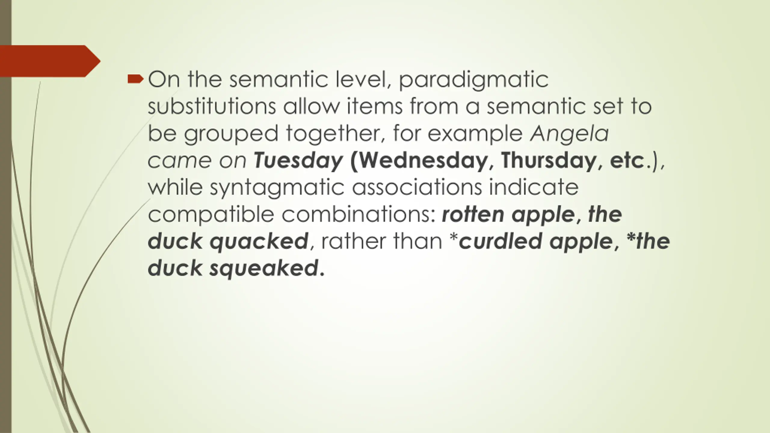 On the semantic level, paradigmatic substitutions allow items from a semantic set to be grouped together, for example Angela came on Tuesday (Wednesday, Thursday, etc.), while syntagmatic associations indicate compatible combinations: rotten apple, the duck quacked, rather than *curdled apple, *the duck squeaked.