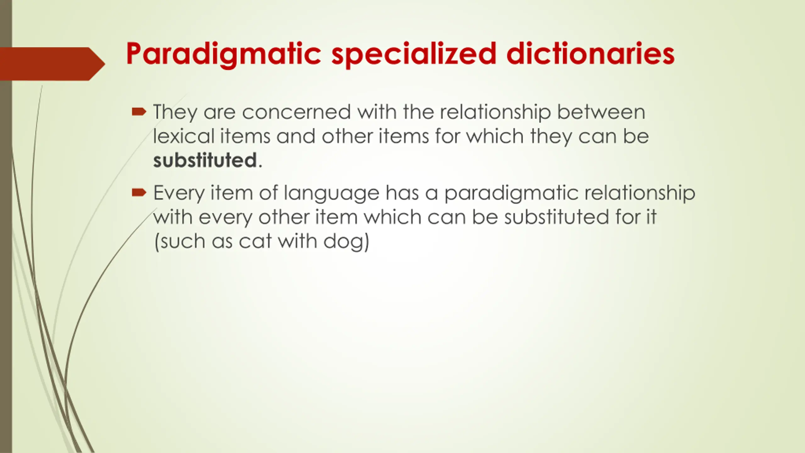 Paradigmatic specialized dictionaries They are concerned with the relationship between lexical items and other items for which they can be substituted. Every item of language has a paradigmatic relationship with every other item which can be substituted for it (such as cat with dog)