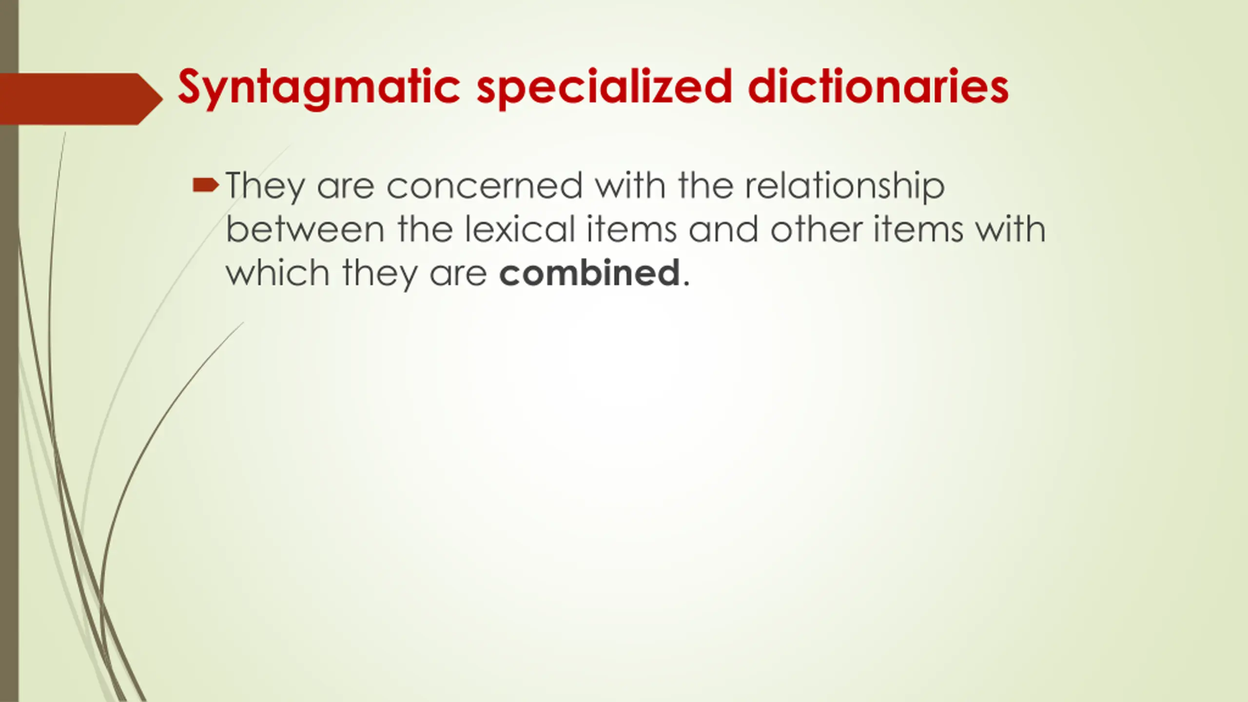Syntagmatic specialized dictionaries They are concerned with the relationship between the lexical items and other items with which they are combined.