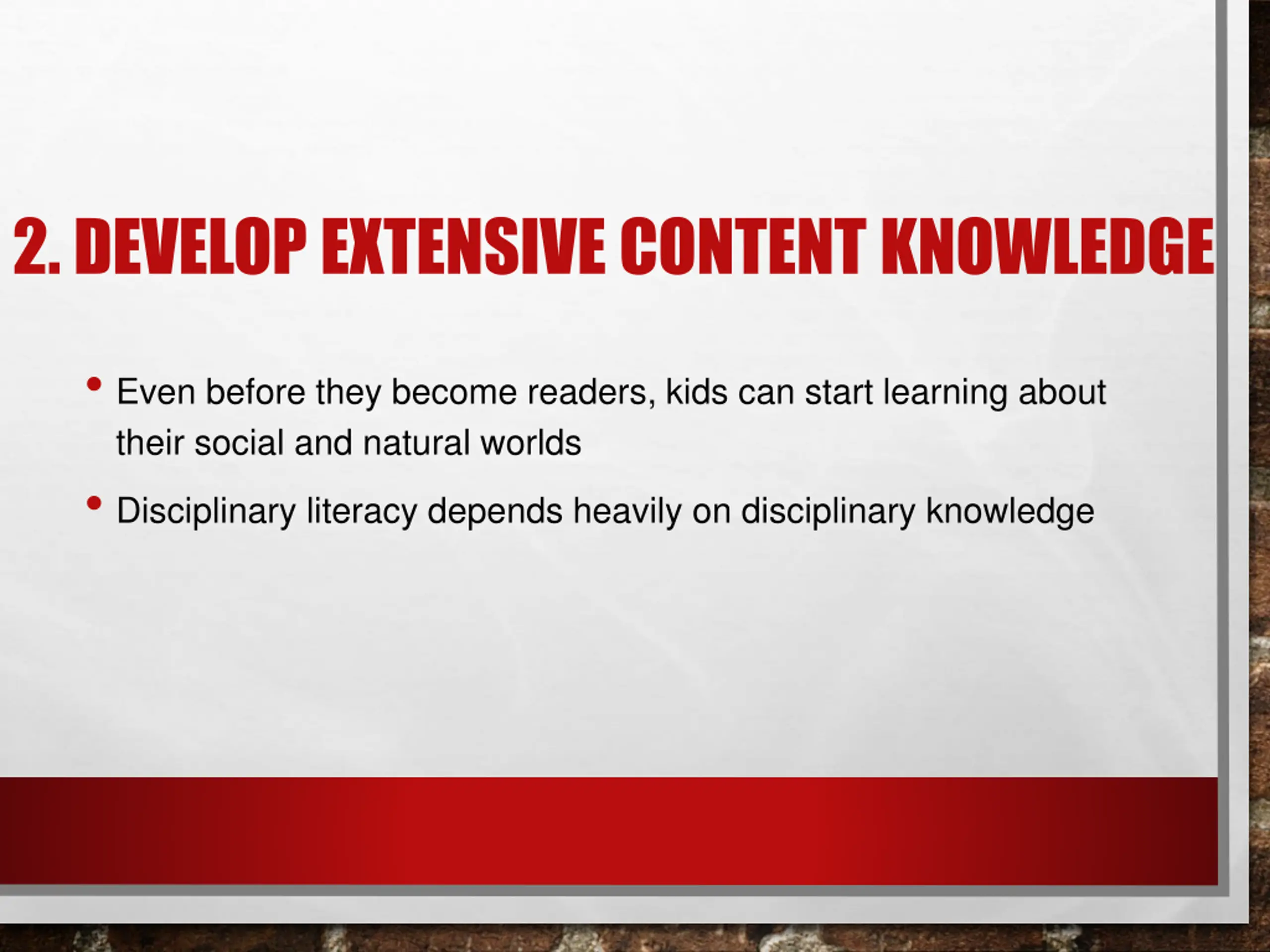 2. DEVELOP EXTENSIVE CONTENT KNOWLEDGE Even before they become readers, kids can start learning about their social and natural worlds Disciplinary literacy depends heavily on disciplinary knowledge