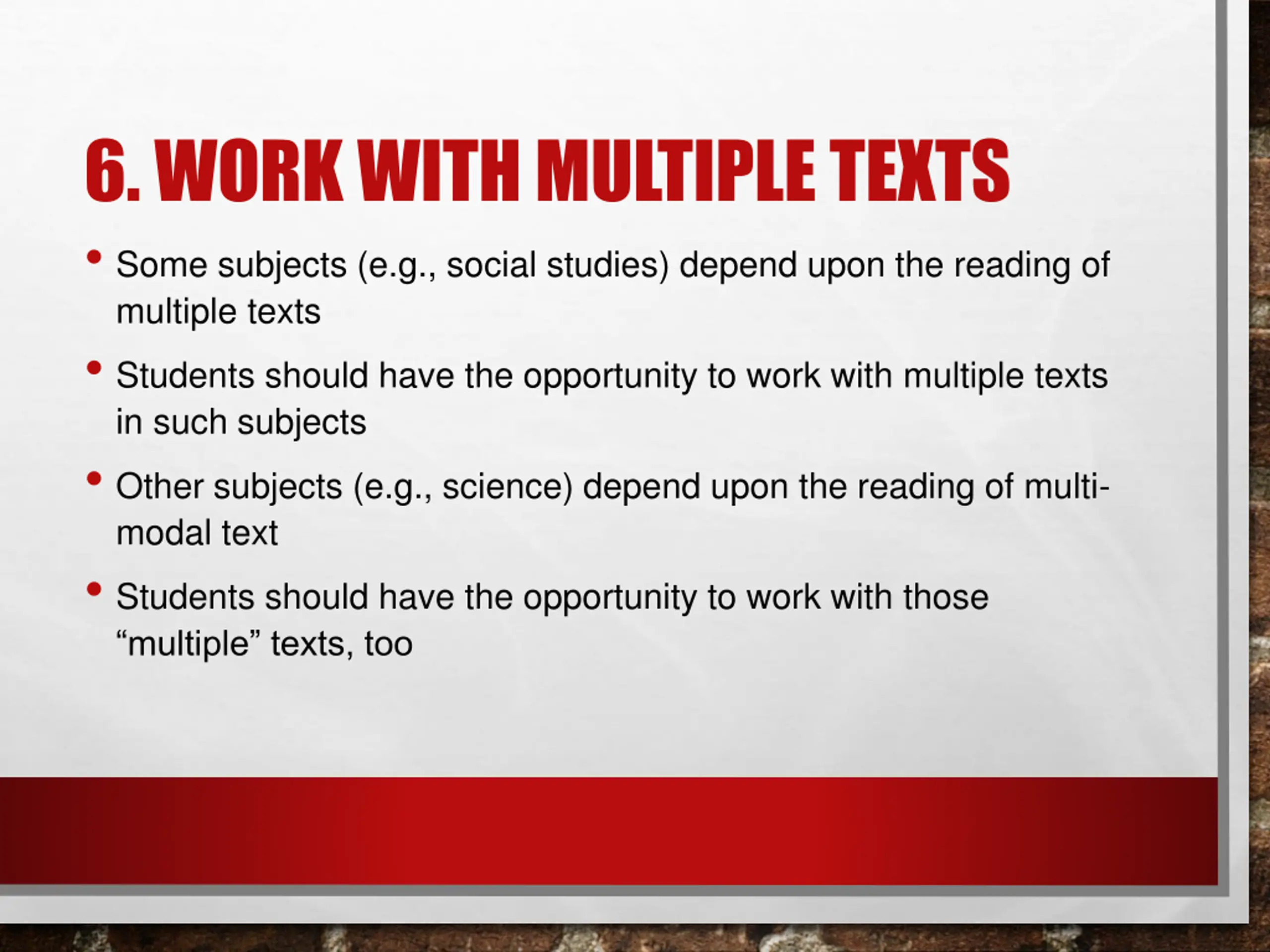 6. WORK WITH MULTIPLE TEXTS Some subjects (e.g., social studies) depend upon the reading of multiple texts Students should have the opportunity to work with multiple texts in such subjects Other subjects (e.g., science) depend upon the reading of multi- modal text Students should have the opportunity to work with those multiple texts, too