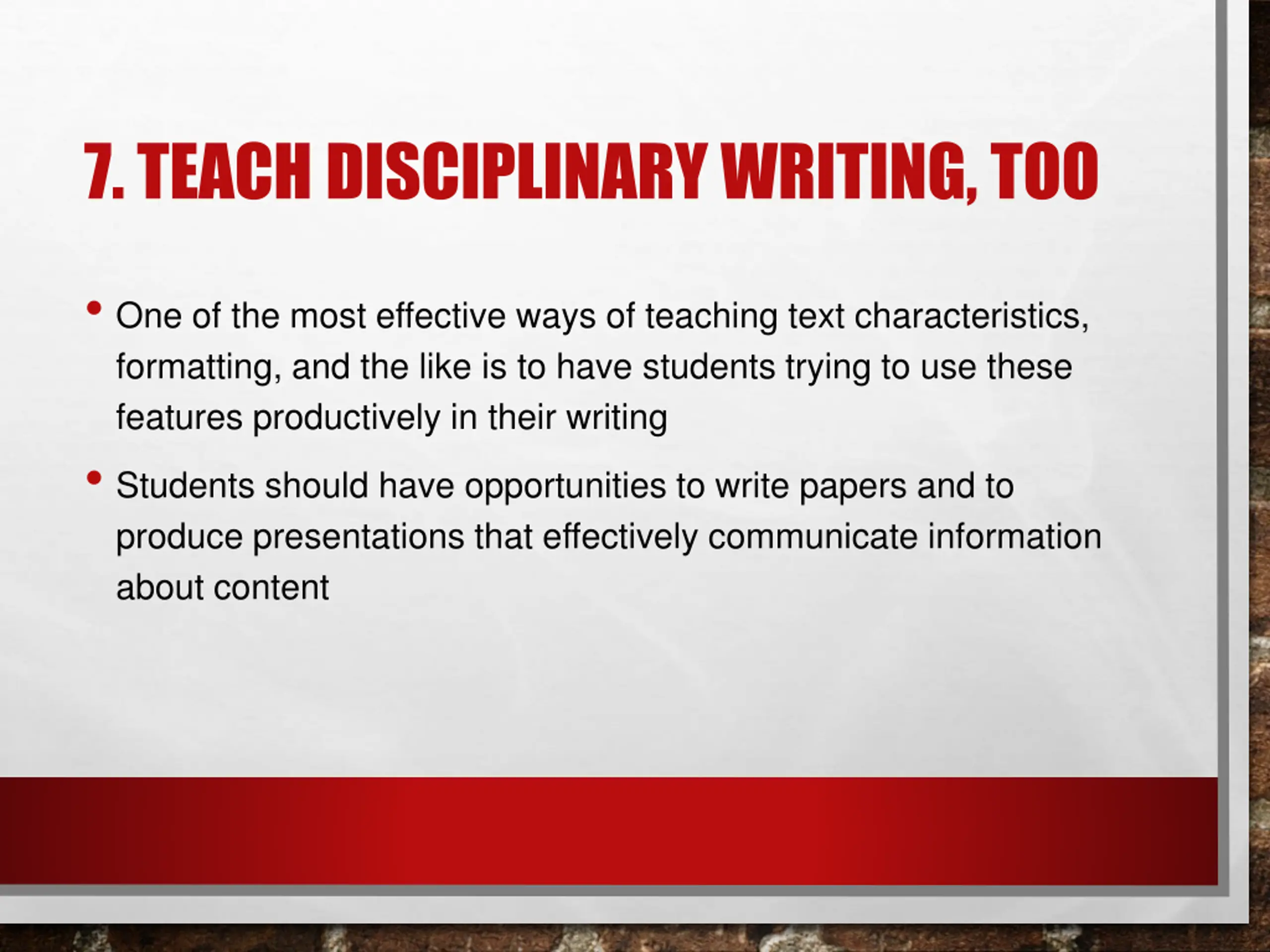 7. TEACH DISCIPLINARY WRITING, TOO One of the most effective ways of teaching text characteristics, formatting, and the like is to have students trying to use these features productively in their writing Students should have opportunities to write papers and to produce presentations that effectively communicate information about content