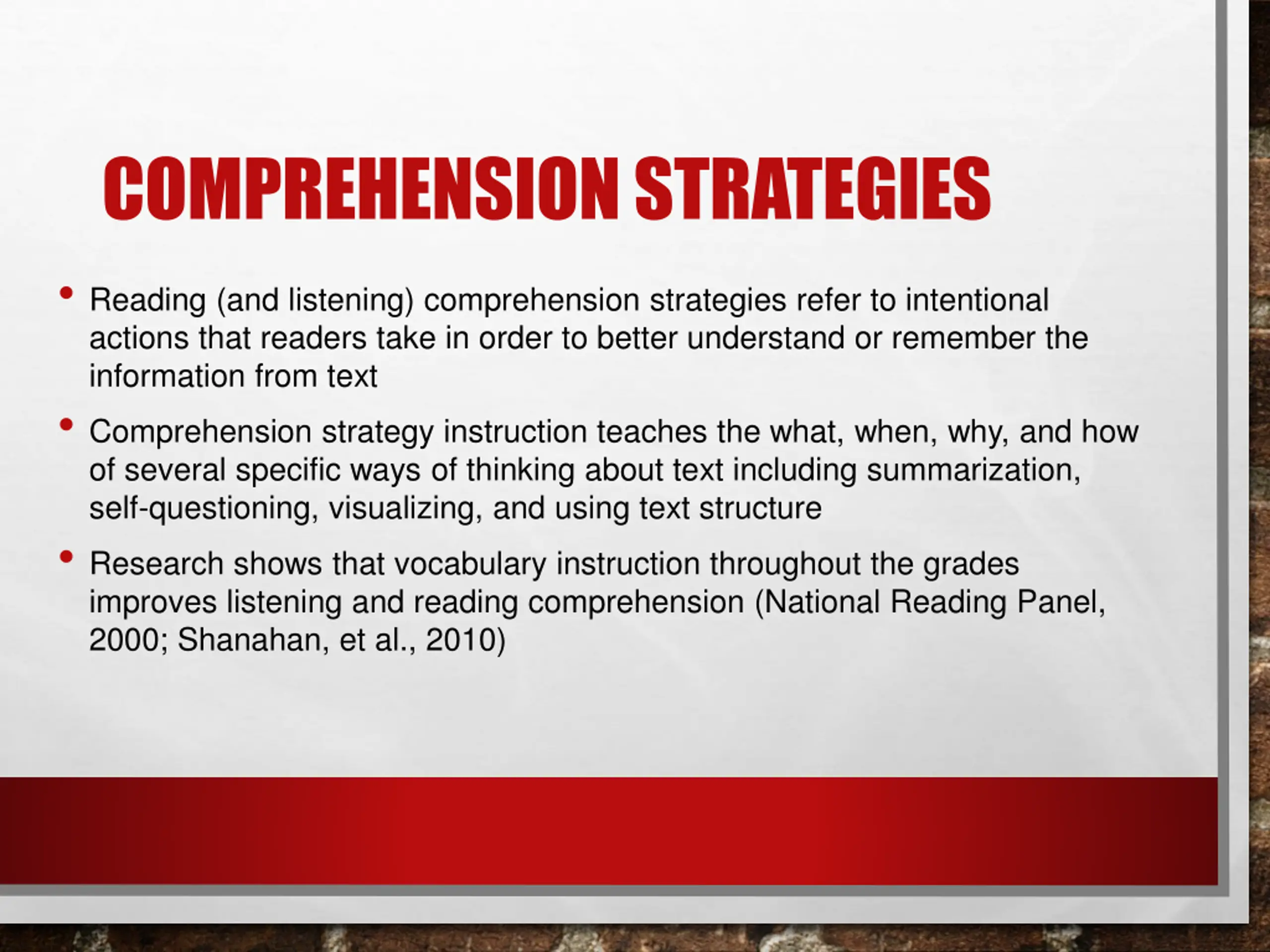 COMPREHENSION STRATEGIES Reading (and listening) comprehension strategies refer to intentional actions that readers take in order to better understand or remember the information from text Comprehension strategy instruction teaches the what, when, why, and how of several specific ways of thinking about text including summarization, self-questioning, visualizing, and using text structure Research shows that vocabulary instruction throughout the grades improves listening and reading comprehension (National Reading Panel, 2000; Shanahan, et al., 2010)