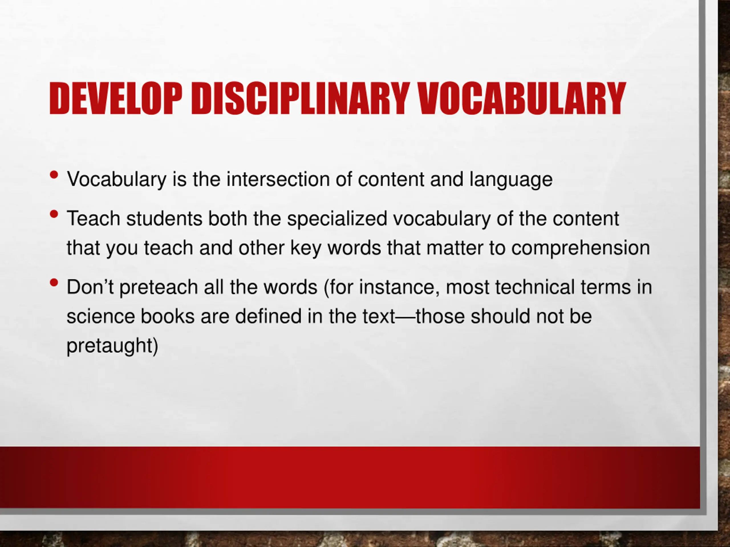 DEVELOP DISCIPLINARY VOCABULARY Vocabulary is the intersection of content and language Teach students both the specialized vocabulary of the content that you teach and other key words that matter to comprehension Don t preteach all the words (for instance, most technical terms in science books are defined in the text those should not be pretaught)