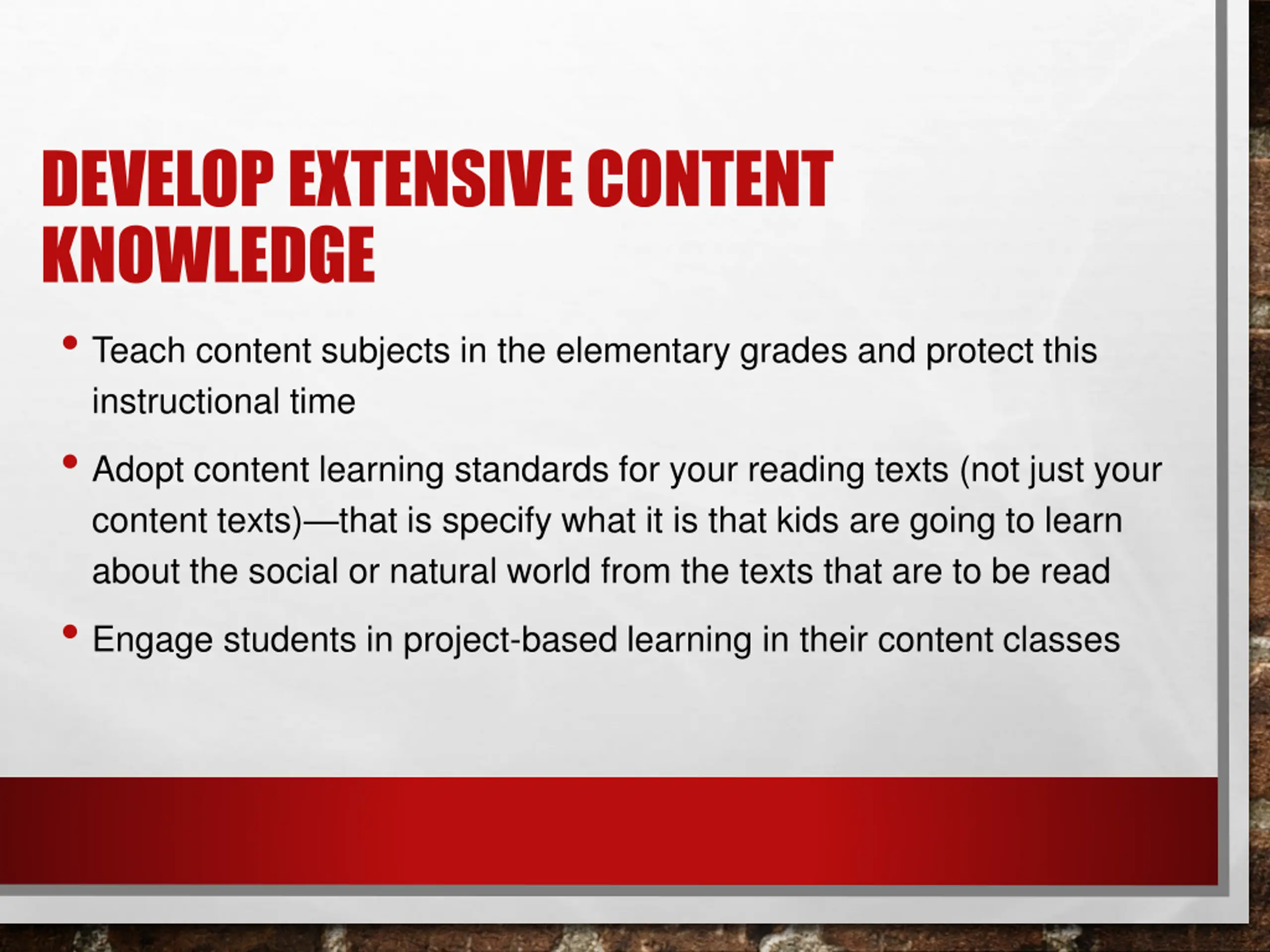 DEVELOP EXTENSIVE CONTENT KNOWLEDGE Teach content subjects in the elementary grades and protect this instructional time Adopt content learning standards for your reading texts (not just your content texts) that is specify what it is that kids are going to learn about the social or natural world from the texts that are to be read Engage students in project-based learning in their content classes