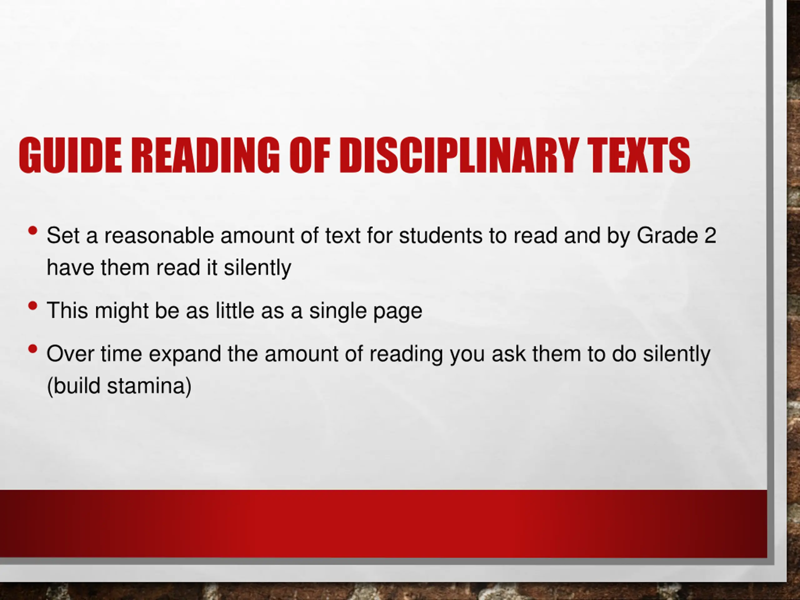 GUIDE READING OF DISCIPLINARY TEXTS Set a reasonable amount of text for students to read and by Grade 2 have them read it silently This might be as little as a single page Over time expand the amount of reading you ask them to do silently (build stamina)