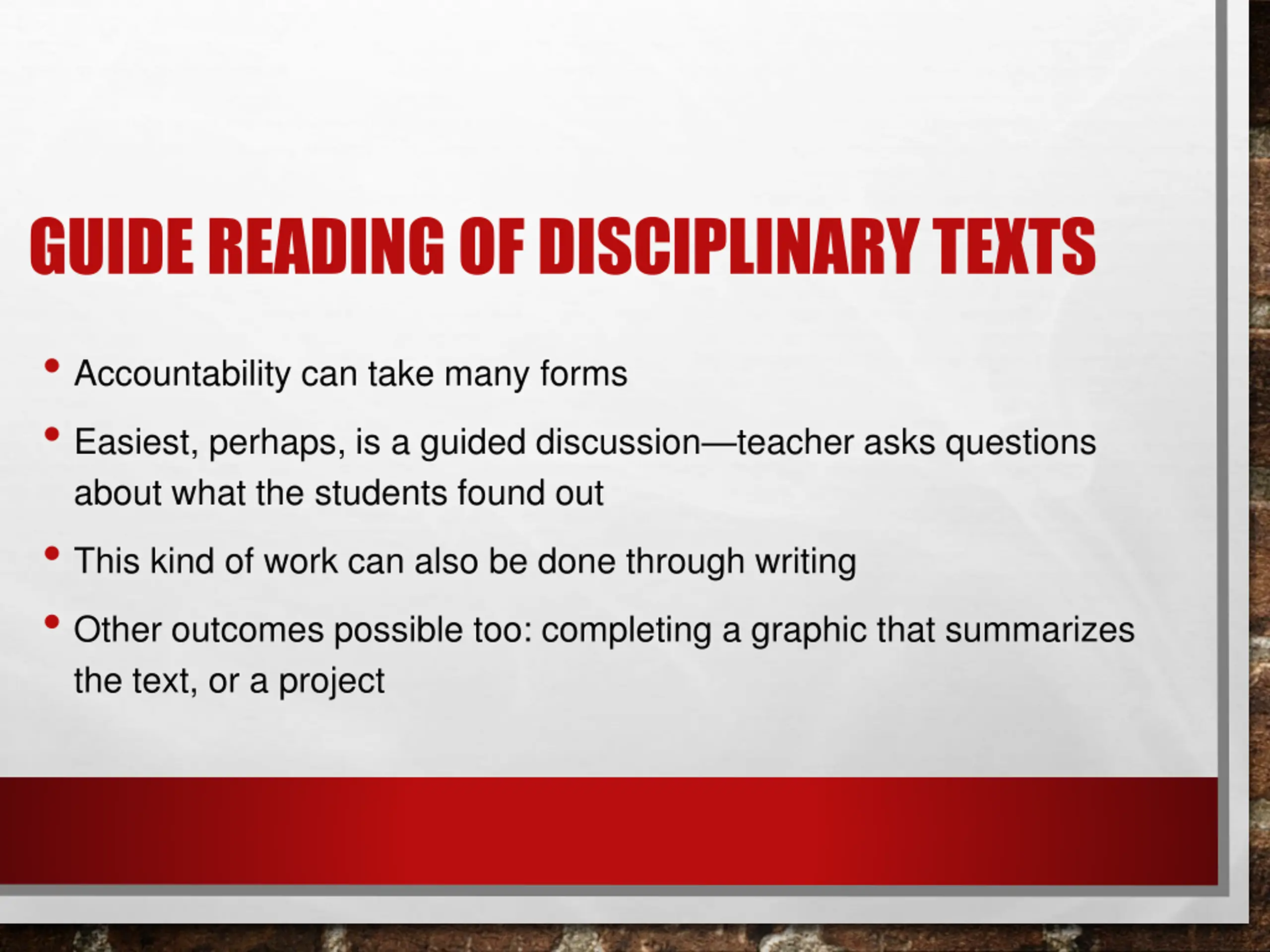 GUIDE READING OF DISCIPLINARY TEXTS Accountability can take many forms Easiest, perhaps, is a guided discussion teacher asks questions about what the students found out This kind of work can also be done through writing Other outcomes possible too: completing a graphic that summarizes the text, or a project
