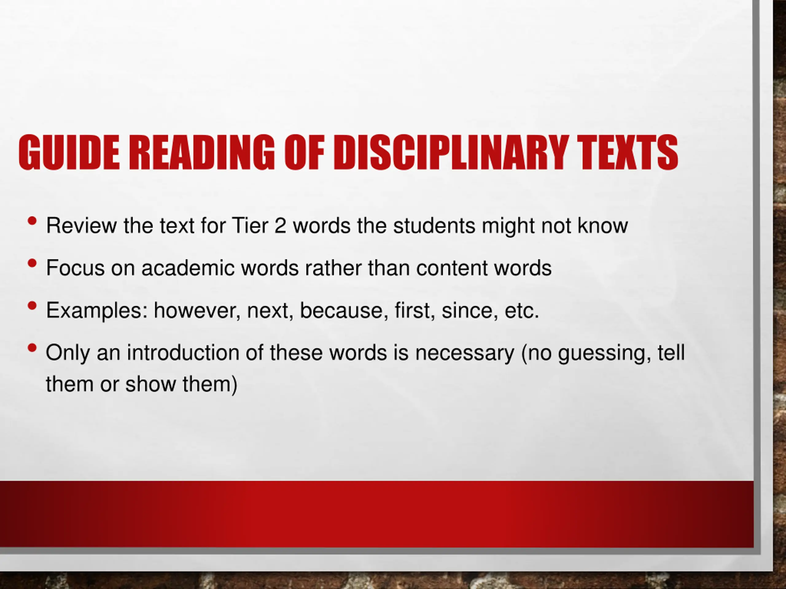 GUIDE READING OF DISCIPLINARY TEXTS Review the text for Tier 2 words the students might not know Focus on academic words rather than content words Examples: however, next, because, first, since, etc. Only an introduction of these words is necessary (no guessing, tell them or show them)