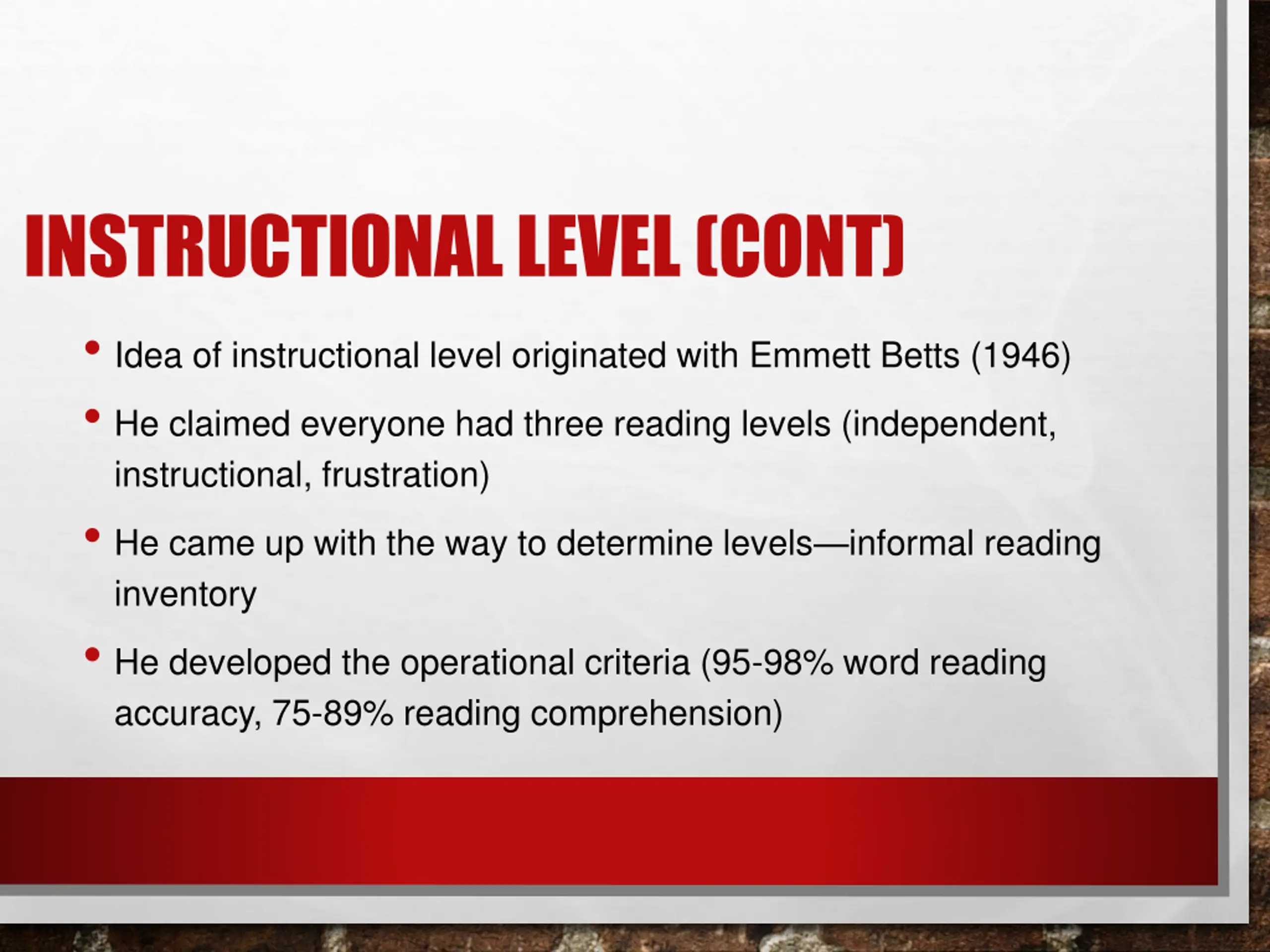 INSTRUCTIONAL LEVEL (CONT) Idea of instructional level originated with Emmett Betts (1946) He claimed everyone had three reading levels (independent, instructional, frustration) He came up with the way to determine levels informal reading inventory He developed the operational criteria (95-98% word reading accuracy, 75-89% reading comprehension)