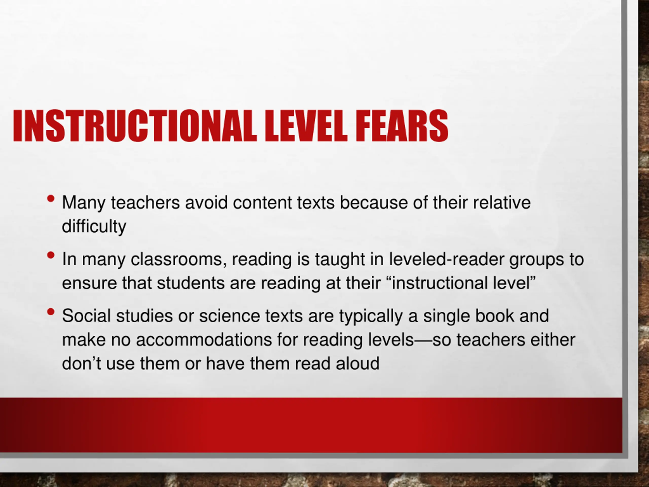 INSTRUCTIONAL LEVEL FEARS Many teachers avoid content texts because of their relative difficulty In many classrooms, reading is taught in leveled-reader groups to ensure that students are reading at their instructional level Social studies or science texts are typically a single book and make no accommodations for reading levels so teachers either don t use them or have them read aloud
