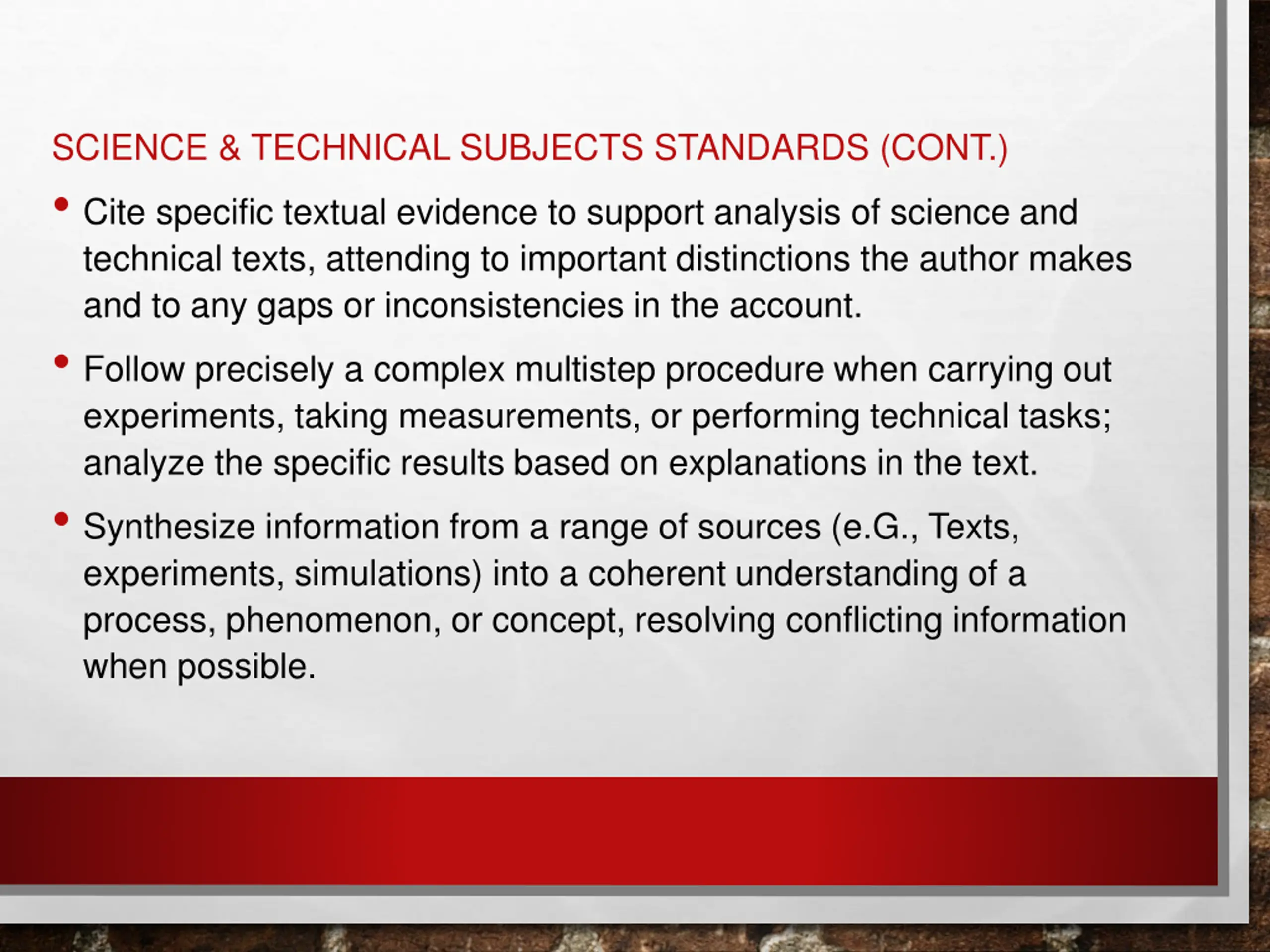 SCIENCE & TECHNICAL SUBJECTS STANDARDS (CONT.) Cite specific textual evidence to support analysis of science and technical texts, attending to important distinctions the author makes and to any gaps or inconsistencies in the account. Follow precisely a complex multistep procedure when carrying out experiments, taking measurements, or performing technical tasks; analyze the specific results based on explanations in the text. Synthesize information from a range of sources (e.G., Texts, experiments, simulations) into a coherent understanding of a process, phenomenon, or concept, resolving conflicting information when possible.