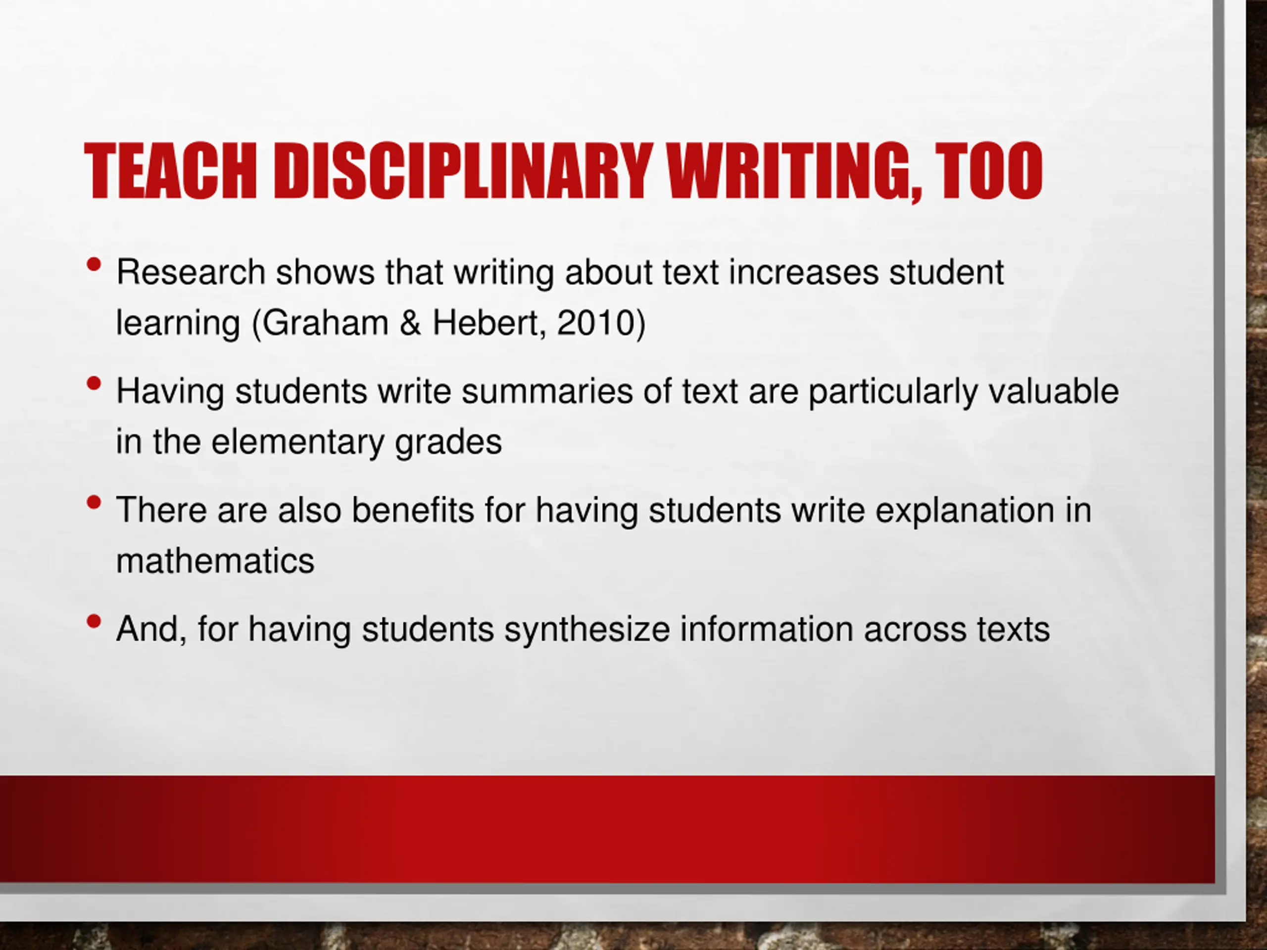 TEACH DISCIPLINARY WRITING, TOO Research shows that writing about text increases student learning (Graham & Hebert, 2010) Having students write summaries of text are particularly valuable in the elementary grades There are also benefits for having students write explanation in mathematics And, for having students synthesize information across texts