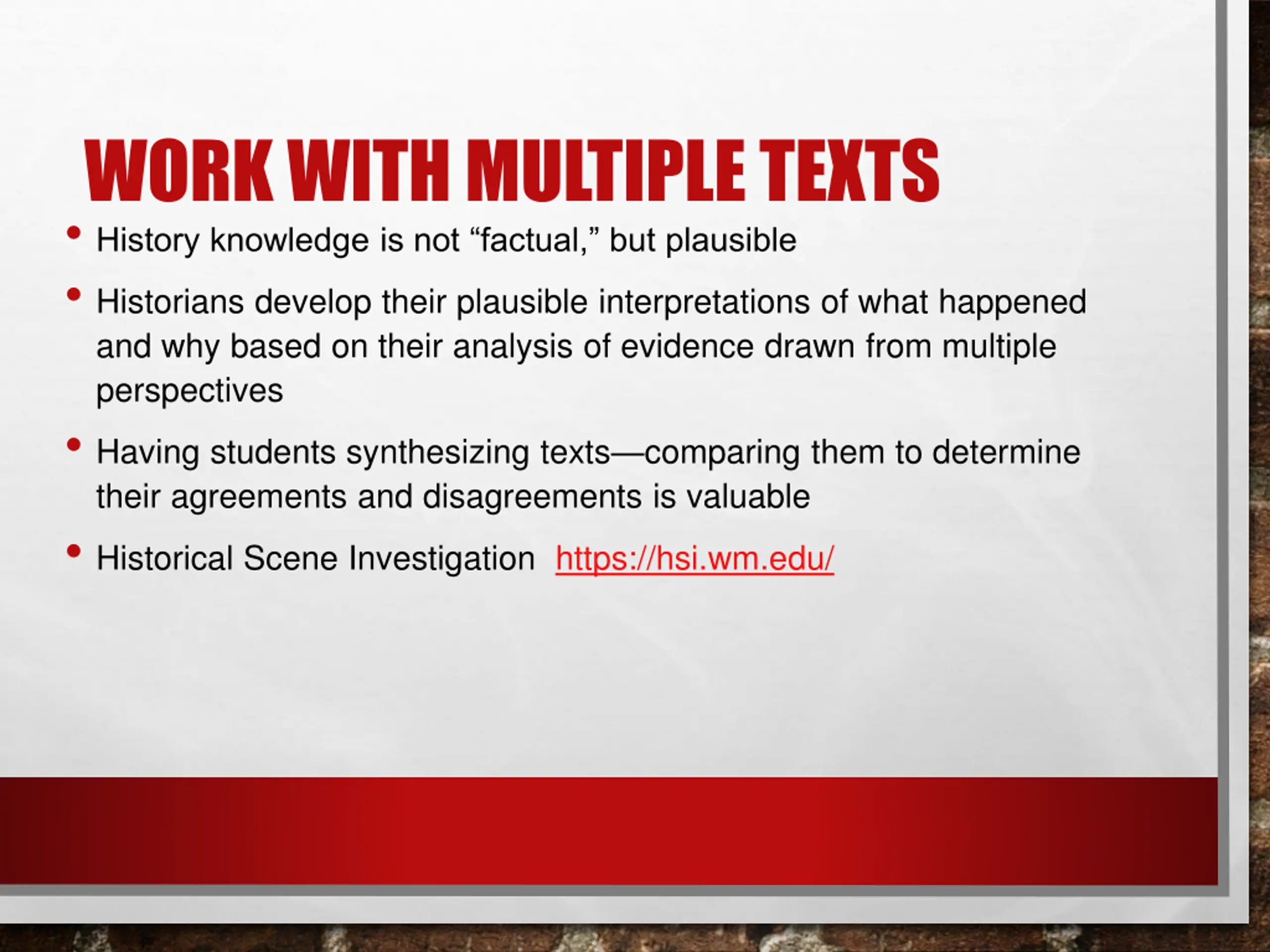 WORK WITH MULTIPLE TEXTS History knowledge is not factual, but plausible Historians develop their plausible interpretations of what happened and why based on their analysis of evidence drawn from multiple perspectives Having students synthesizing texts comparing them to determine their agreements and disagreements is valuable Historical Scene Investigation https://hsi.wm.edu/