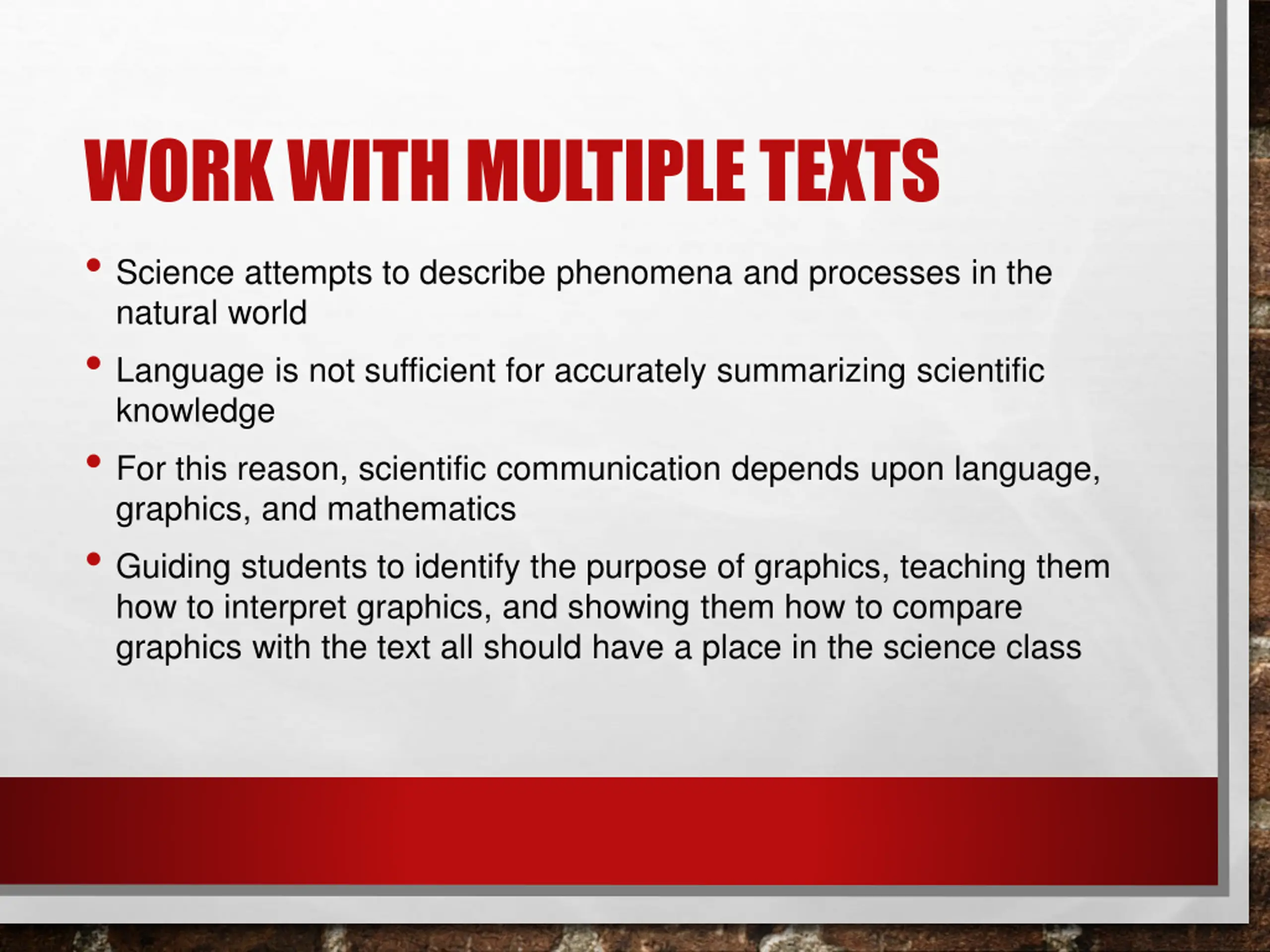 WORK WITH MULTIPLE TEXTS Science attempts to describe phenomena and processes in the natural world Language is not sufficient for accurately summarizing scientific knowledge For this reason, scientific communication depends upon language, graphics, and mathematics Guiding students to identify the purpose of graphics, teaching them how to interpret graphics, and showing them how to compare graphics with the text all should have a place in the science class