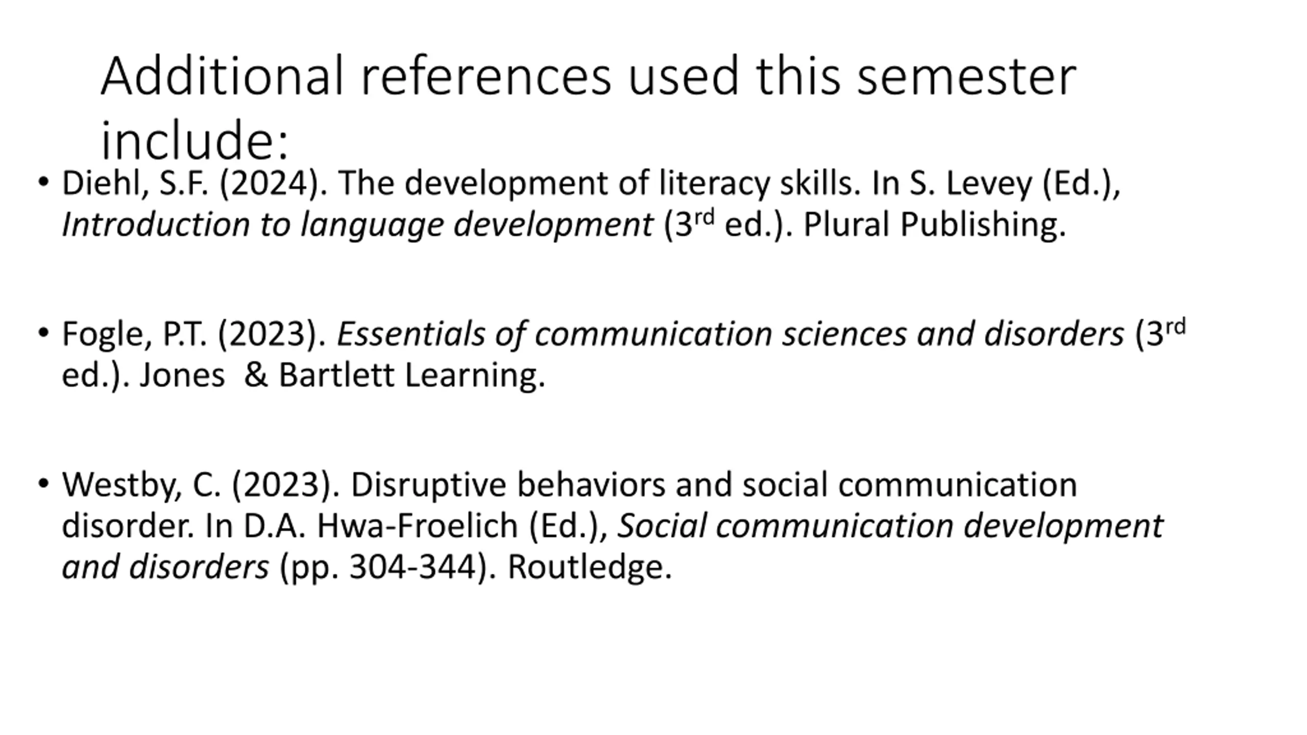 Additional references used this semester include: Diehl, S.F. (2024). The development of literacy skills. In S. Levey (Ed.), Introduction to language development (3rded.). Plural Publishing. Fogle, P.T. (2023). Essentials of communication sciences and disorders (3rd ed.). Jones & Bartlett Learning. Westby, C. (2023). Disruptive behaviors and social communication disorder. In D.A. Hwa-Froelich (Ed.), Social communication development and disorders (pp. 304-344). Routledge.