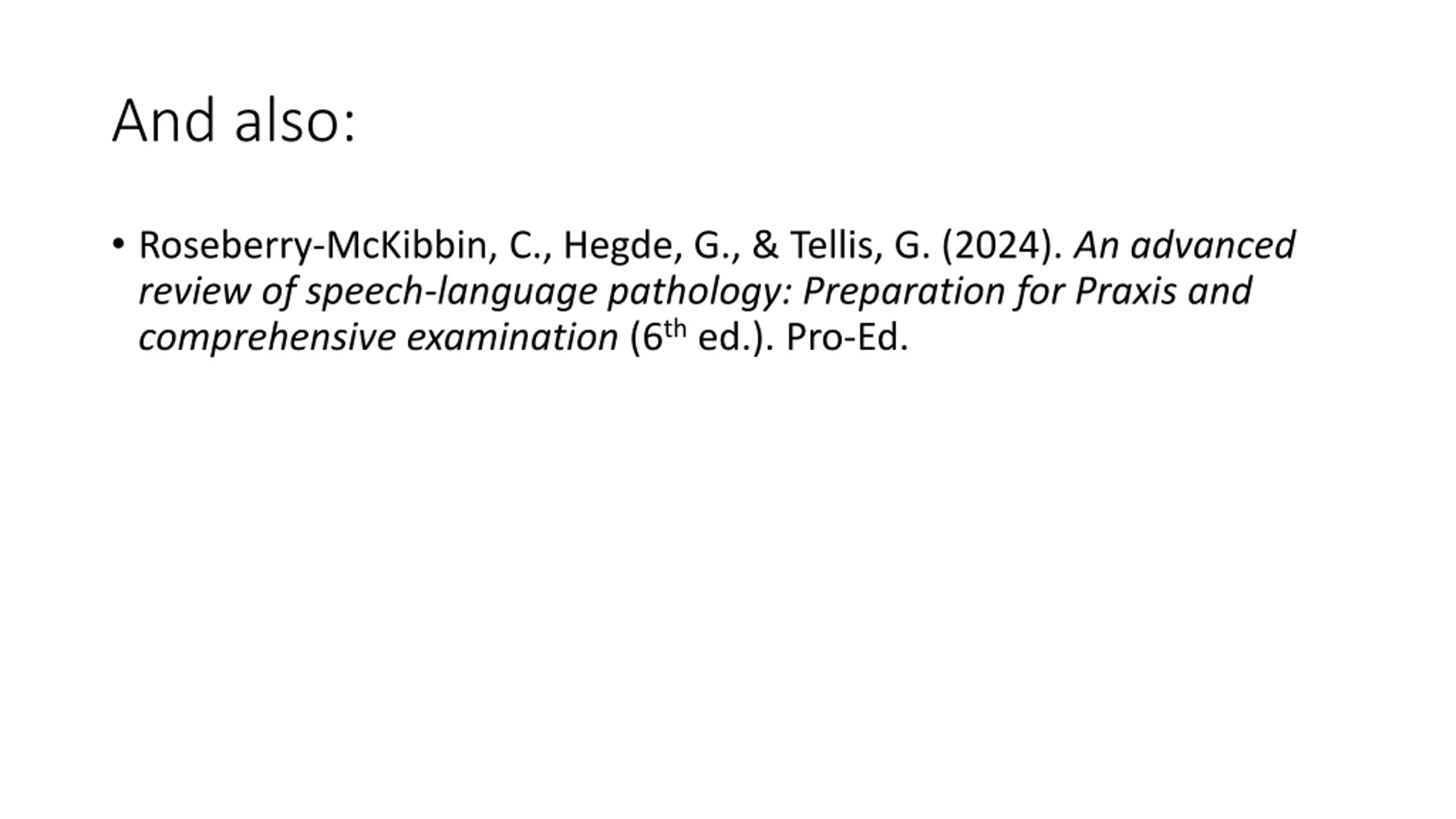 And also: Roseberry-McKibbin, C., Hegde, G., & Tellis, G. (2024). An advanced review of speech-language pathology: Preparation for Praxis and comprehensive examination (6thed.). Pro-Ed.