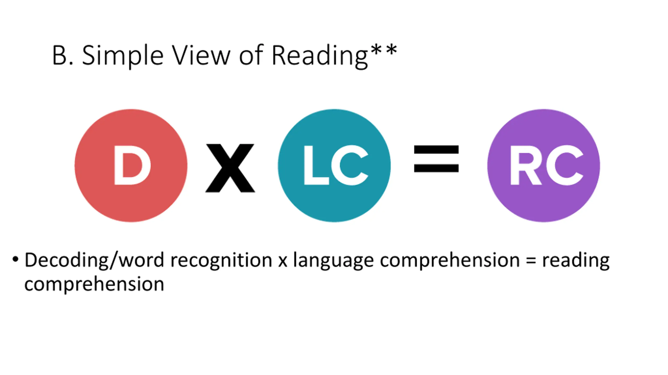 B. Simple View of Reading** Decoding/word recognition x language comprehension = reading comprehension