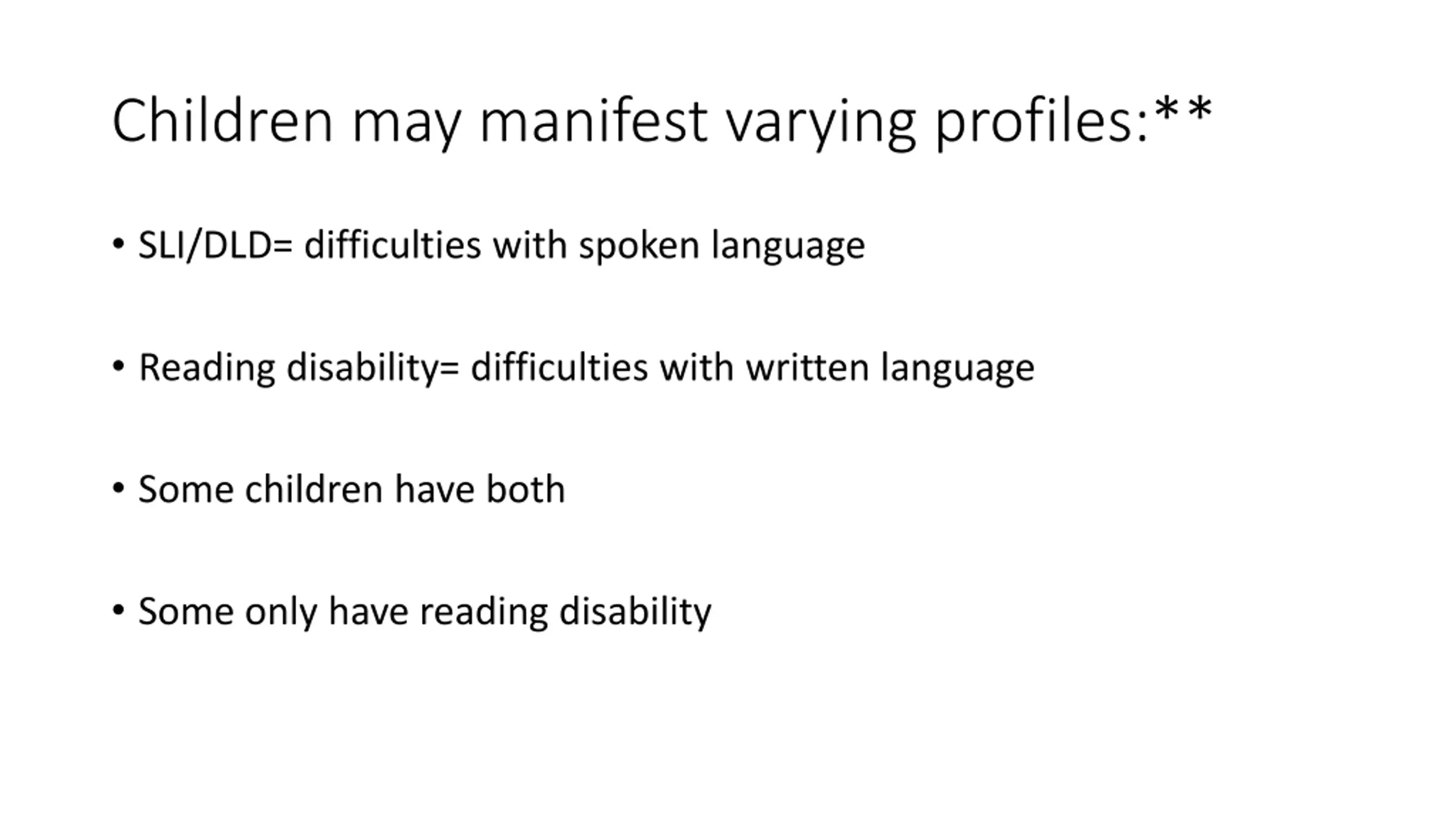 Children may manifest varying profiles:** SLI/DLD= difficulties with spoken language Reading disability= difficulties with written language Some children have both Some only have reading disability