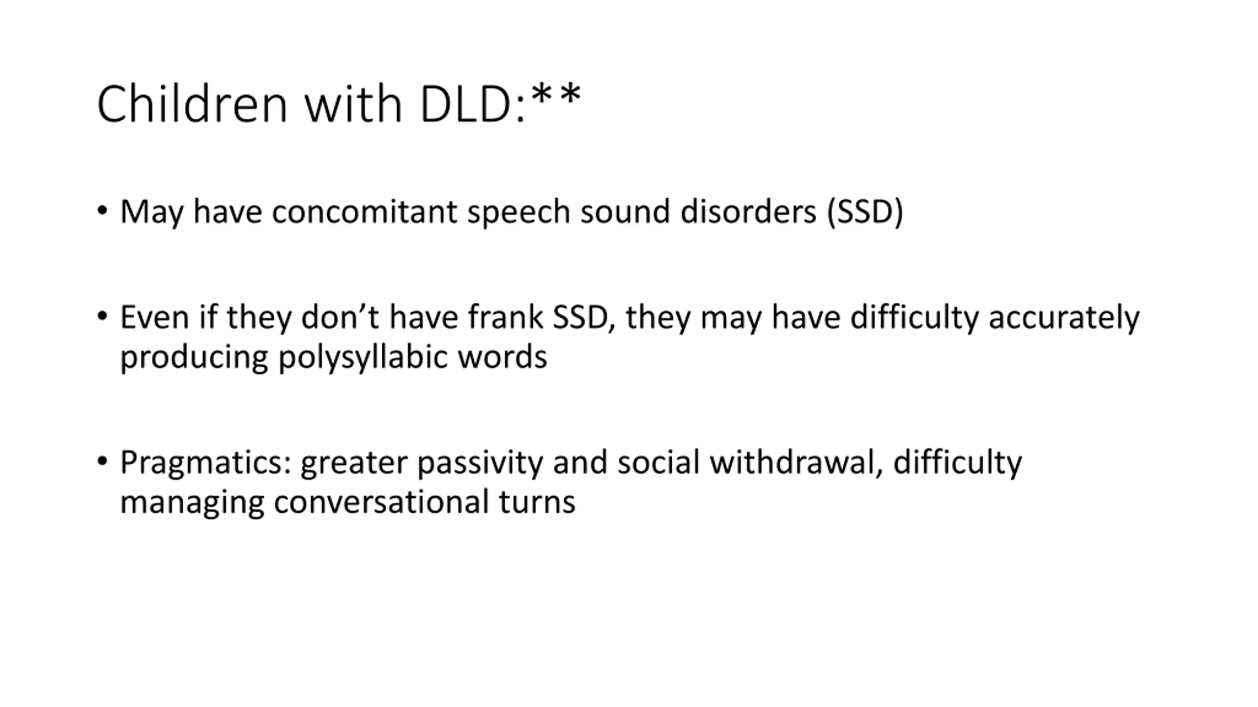 Children with DLD:** May have concomitant speech sound disorders (SSD) Even if they don t have frank SSD, they may have difficulty accurately producing polysyllabic words Pragmatics: greater passivity and social withdrawal, difficulty managing conversational turns