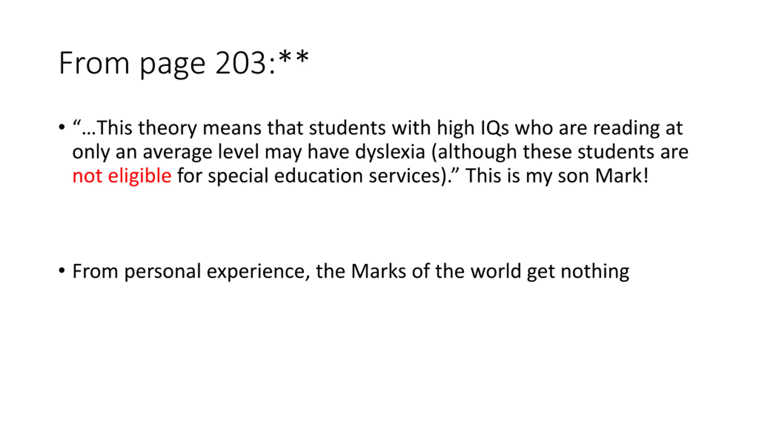 From page 203:** This theory means that students with high IQs who are reading at only an average level may have dyslexia (although these students are not eligible for special education services). This is my son Mark! From personal experience, the Marks of the world get nothing