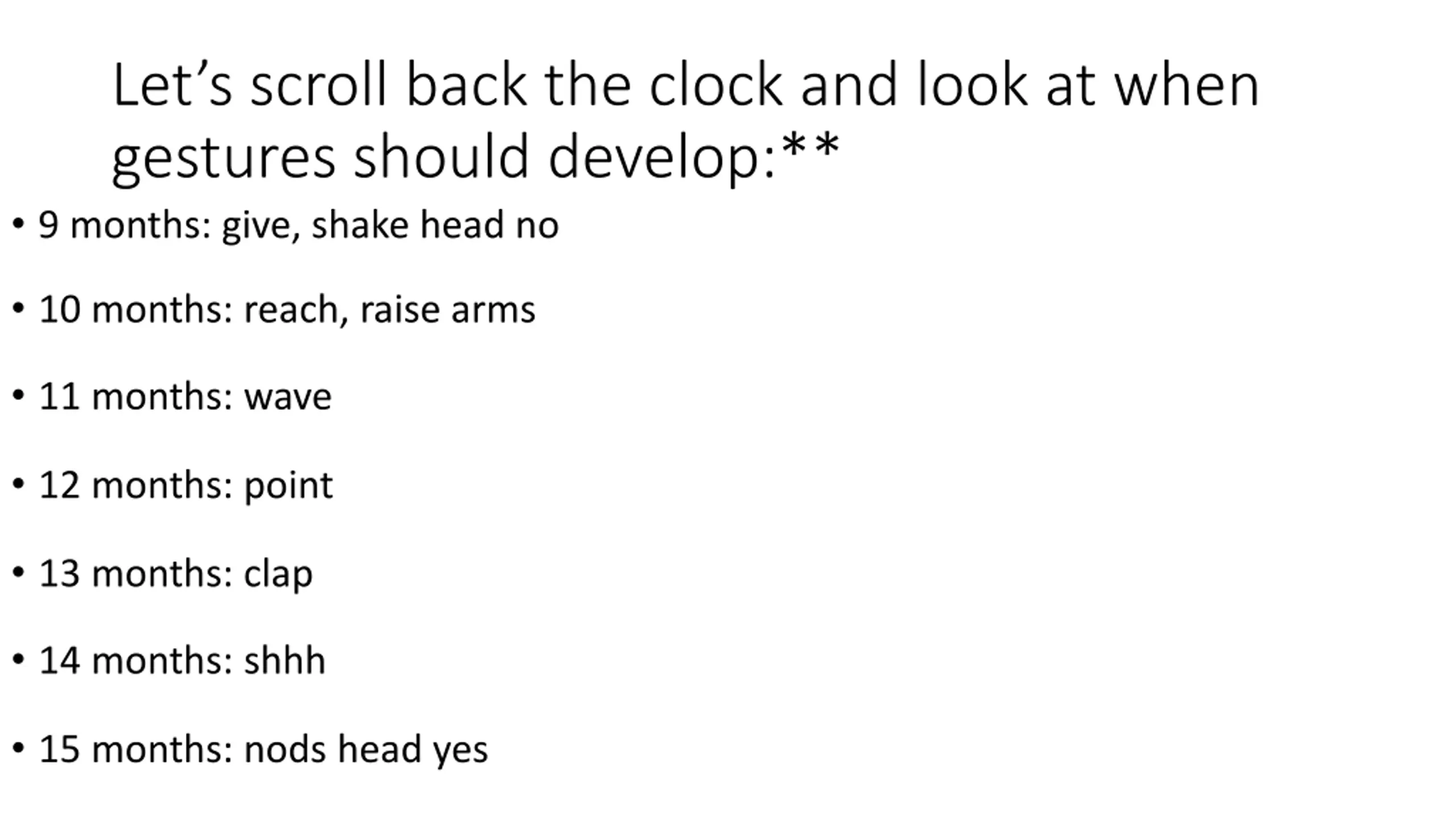 Lets scroll back the clock and look at when gestures should develop:** 9 months: give, shake head no 10 months: reach, raise arms 11 months: wave 12 months: point 13 months: clap 14 months: shhh 15 months: nods head yes