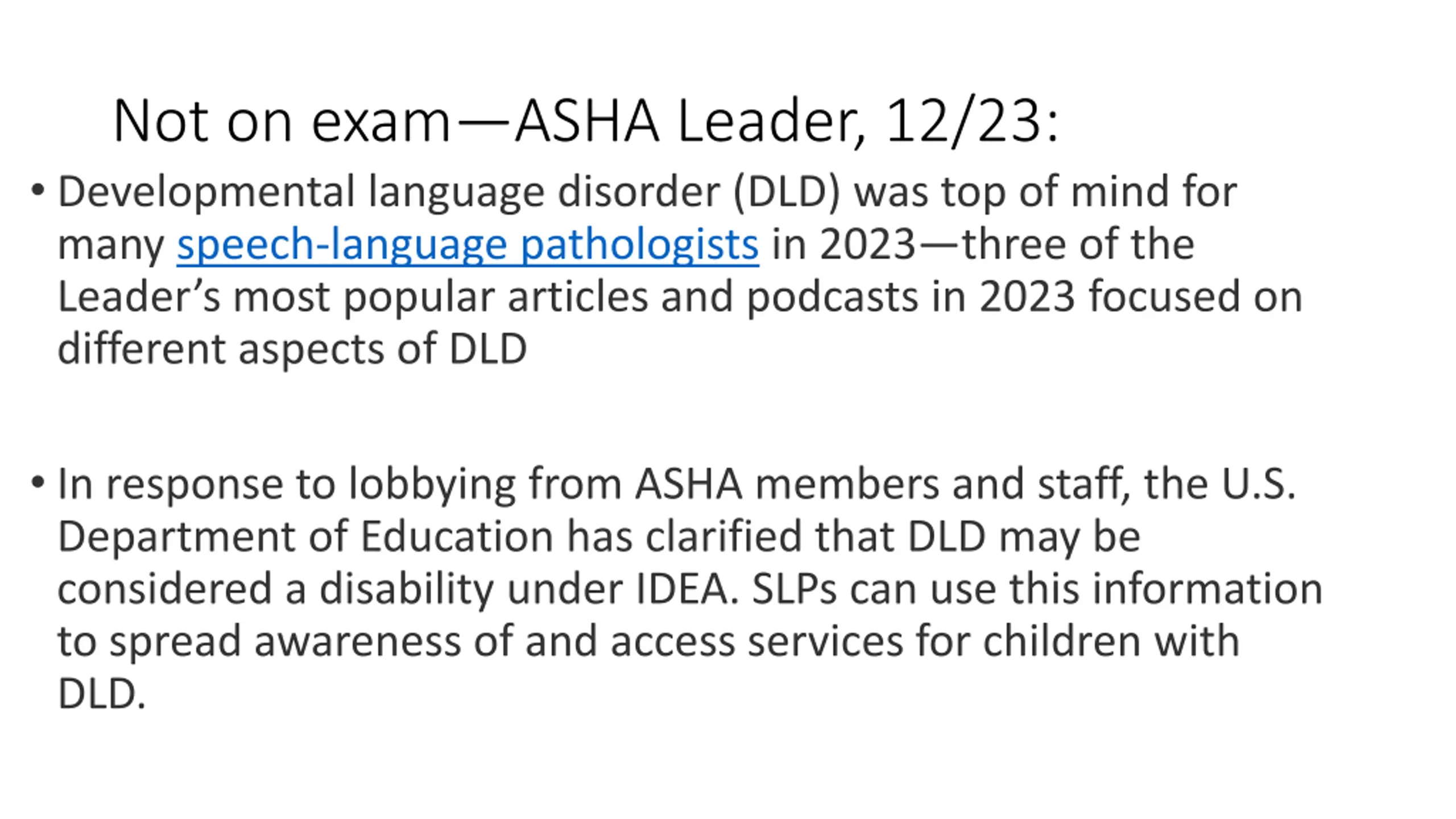 Not on examASHA Leader, 12/23: Developmental language disorder (DLD) was top of mind for many speech-language pathologists in 2023 three of the Leader s most popular articles and podcasts in 2023 focused on different aspects of DLD In response to lobbying from ASHA members and staff, the U.S. Department of Education has clarified that DLD may be considered a disability under IDEA. SLPs can use this information to spread awareness of and access services for children with DLD.
