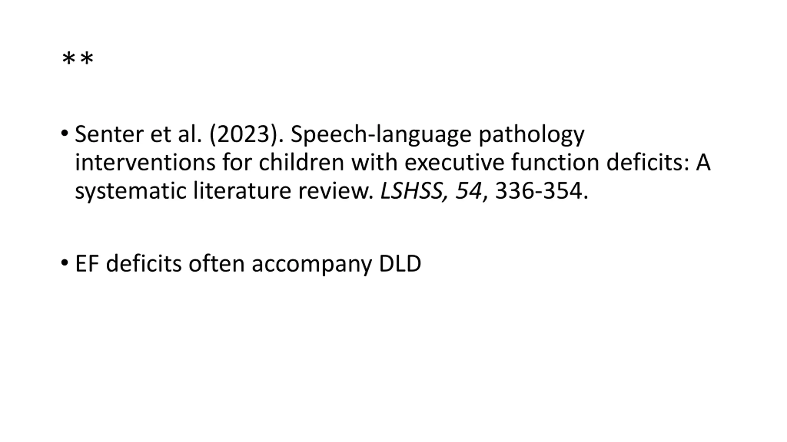 ** Senter et al. (2023). Speech-language pathology interventions for children with executive function deficits: A systematic literature review. LSHSS, 54, 336-354. EF deficits often accompany DLD