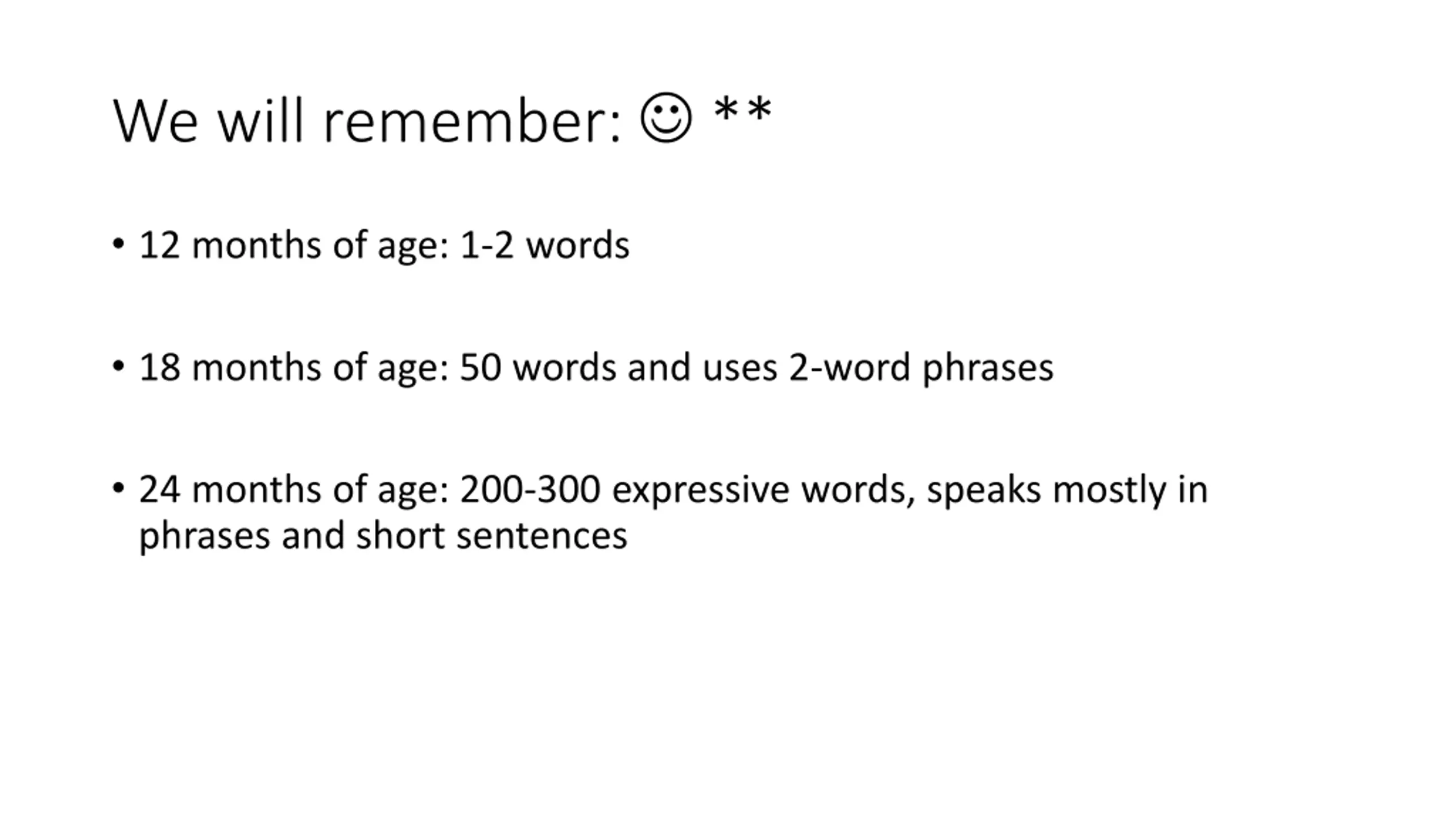 We will remember: ** 12 months of age: 1-2 words 18 months of age: 50 words and uses 2-word phrases 24 months of age: 200-300 expressive words, speaks mostly in phrases and short sentences