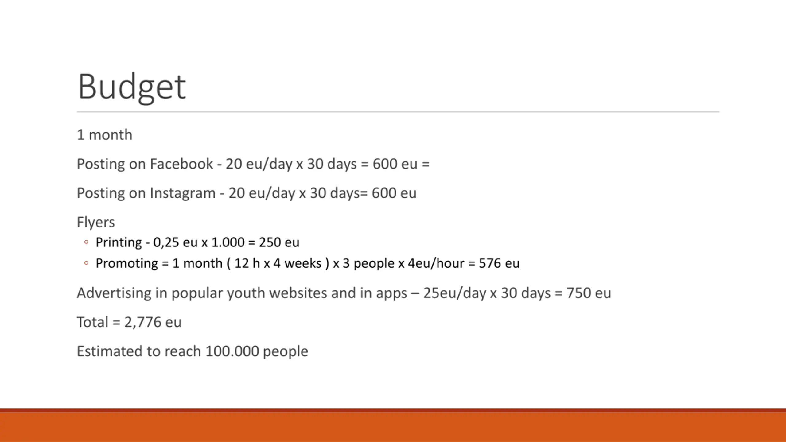 Budget 1 month Posting on Facebook - 20 eu/day x 30 days = 600 eu = Posting on Instagram - 20 eu/day x 30 days= 600 eu Flyers Printing - 0,25 eu x 1.000 = 250 eu Promoting = 1 month ( 12 h x 4 weeks ) x 3 people x 4eu/hour = 576 eu Advertising in popular youth websites and in apps 25eu/day x 30 days = 750 eu Total = 2,776 eu Estimated to reach 100.000 people