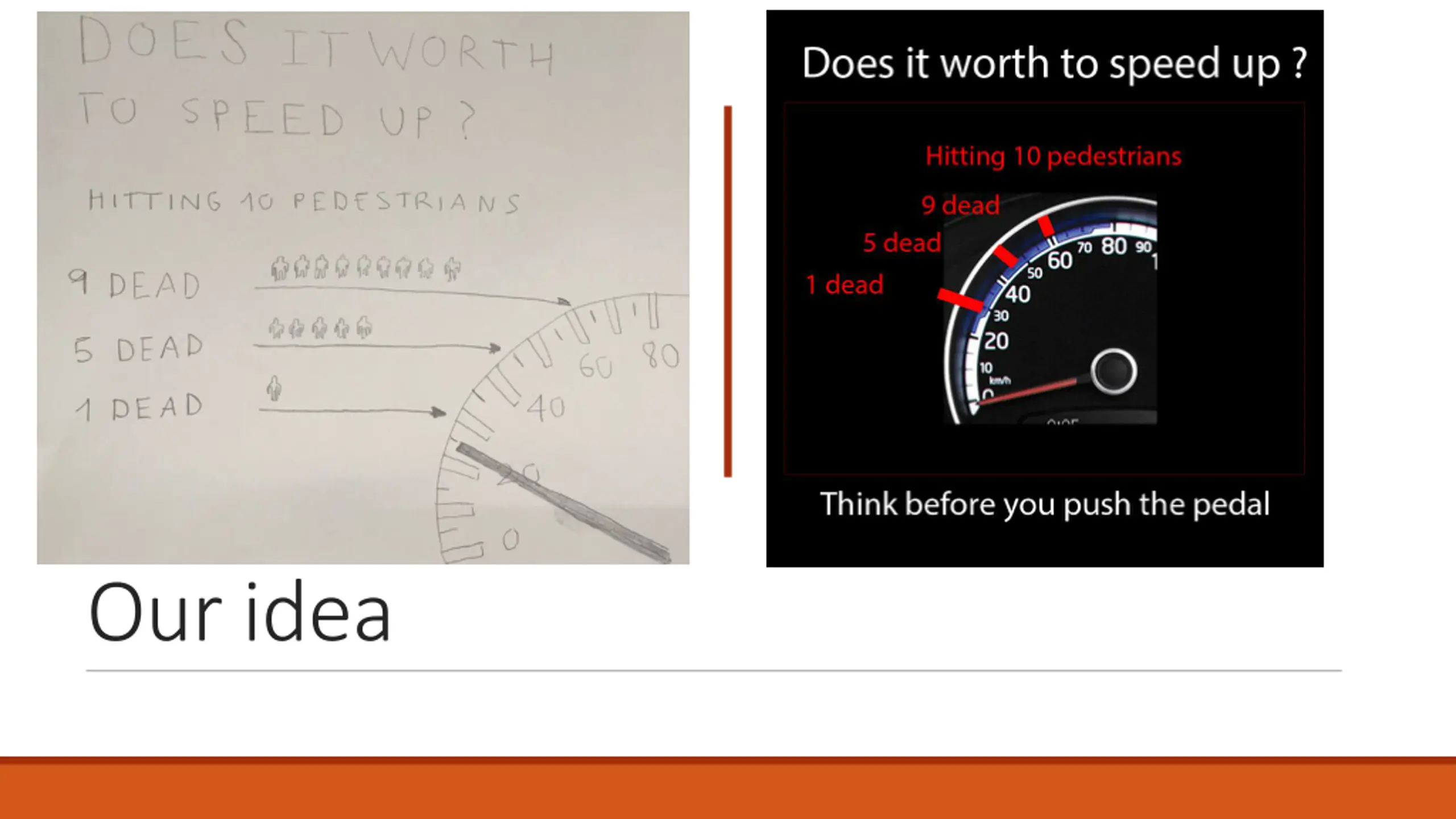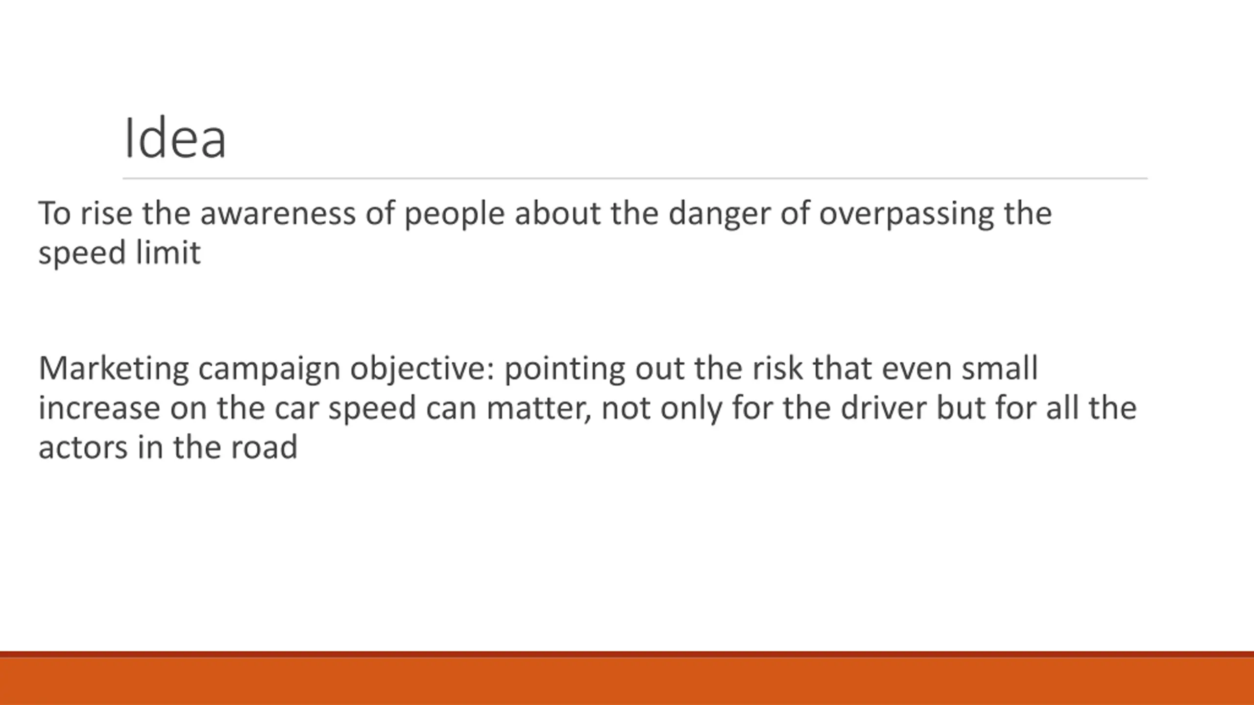 Idea To rise the awareness of people about the danger of overpassing the speed limit Marketing campaign objective: pointing out the risk that even small increase on the car speed can matter, not only for the driver but for all the actors in the road