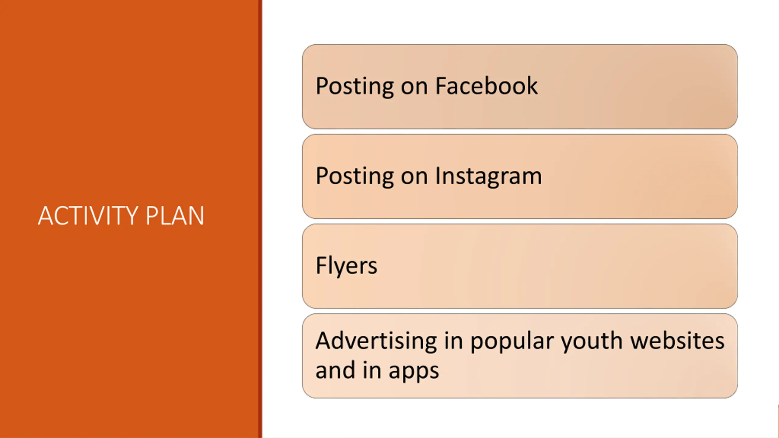 Posting on Facebook Posting on Instagram ACTIVITY PLAN Flyers Advertising in popular youth websites and in apps