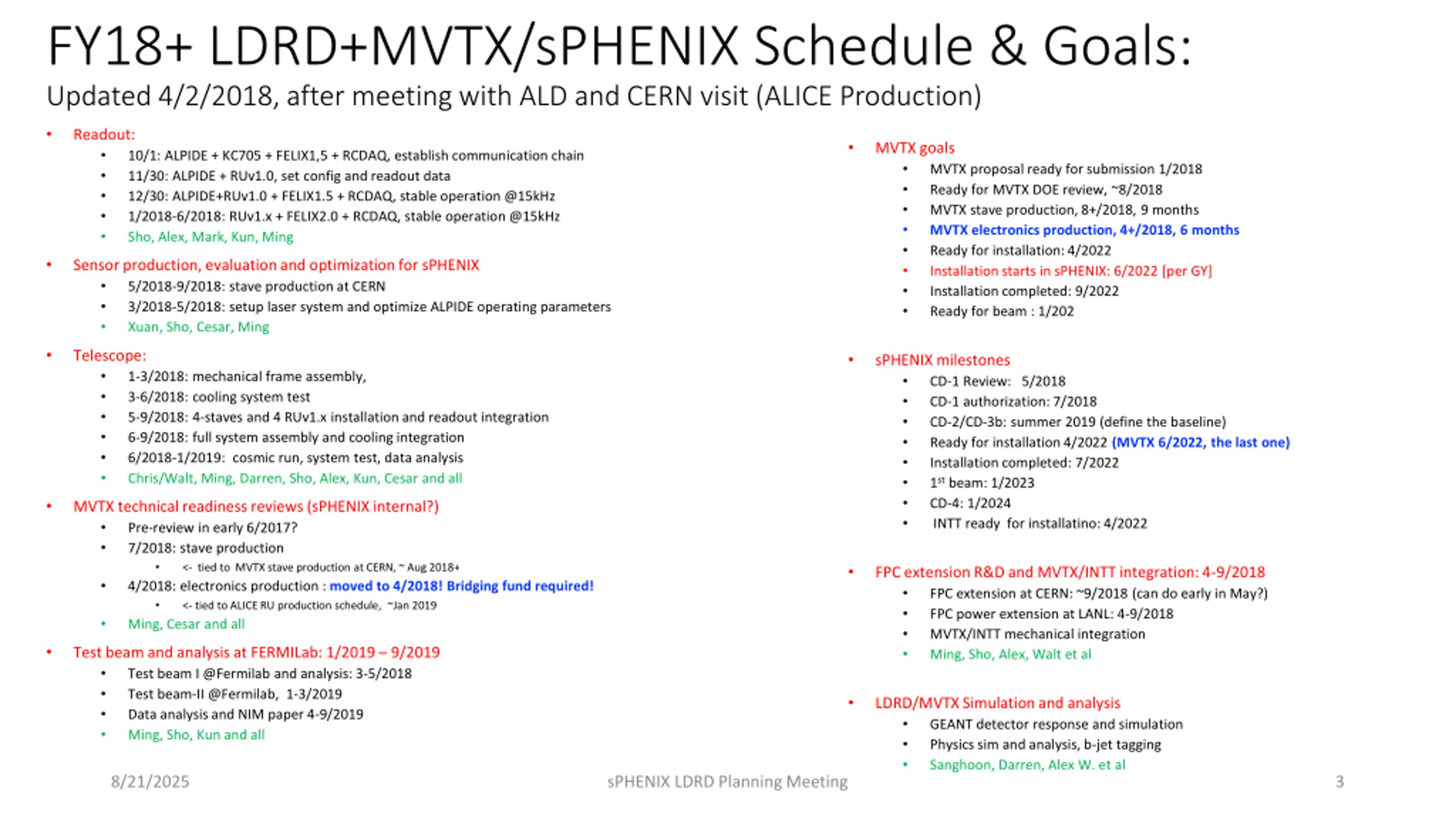 FY18+ LDRD+MVTX/sPHENIX Schedule & Goals: Updated 4/2/2018, after meeting with ALD and CERN visit (ALICE Production) Readout: MVTX goals 10/1: ALPIDE + KC705 + FELIX1,5 + RCDAQ, establish communication chain 11/30: ALPIDE + RUv1.0, set config and readout data 12/30: ALPIDE+RUv1.0 + FELIX1.5 + RCDAQ, stable operation @15kHz 1/2018-6/2018: RUv1.x + FELIX2.0 + RCDAQ, stable operation @15kHz Sho, Alex, Mark, Kun, Ming MVTX proposal ready for submission 1/2018 Ready for MVTX DOE review, ~8/2018 MVTX stave production, 8+/2018, 9 months MVTX electronics production, 4+/2018, 6 months Ready for installation: 4/2022 Installation starts in sPHENIX: 6/2022 [per GY] Installation completed: 9/2022 Ready for beam : 1/202 Sensor production, evaluation and optimization for sPHENIX 5/2018-9/2018: stave production at CERN 3/2018-5/2018: setup laser system and optimize ALPIDE operating parameters Xuan, Sho, Cesar, Ming Telescope: sPHENIX milestones CD-1 Review: 5/2018 CD-1 authorization: 7/2018 CD-2/CD-3b: summer 2019 (define the baseline) Ready for installation 4/2022 (MVTX 6/2022, the last one) Installation completed: 7/2022 1st beam: 1/2023 CD-4: 1/2024 INTT ready for installatino: 4/2022 1-3/2018: mechanical frame assembly, 3-6/2018: cooling system test 5-9/2018: 4-staves and 4 RUv1.x installation and readout integration 6-9/2018: full system assembly and cooling integration 6/2018-1/2019: cosmic run, system test, data analysis Chris/Walt, Ming, Darren, Sho, Alex, Kun, Cesar and all MVTX technical readiness reviews (sPHENIX internal?) Pre-review in early 6/2017? 7/2018: stave production <- tied to MVTX stave production at CERN, ~ Aug 2018+ 4/2018: electronics production : moved to 4/2018! Bridging fund required! <- tied to ALICE RU production schedule, ~Jan 2019 Ming, Cesar and all FPC extension R&D and MVTX/INTT integration: 4-9/2018 FPC extension at CERN: ~9/2018 (can do early in May?) FPC power extension at LANL: 4-9/2018 MVTX/INTT mechanical integration Ming, Sho, Alex, Walt et al Test beam and analysis at FERMILab: 1/2019 9/2019 Test beam I @Fermilab and analysis: 3-5/2018 Test beam-II @Fermilab, 1-3/2019 Data analysis and NIM paper 4-9/2019 Ming, Sho, Kun and all LDRD/MVTX Simulation and analysis GEANT detector response and simulation Physics sim and analysis, b-jet tagging Sanghoon, Darren, Alex W. et al 8/21/2025 sPHENIX LDRD Planning Meeting 3