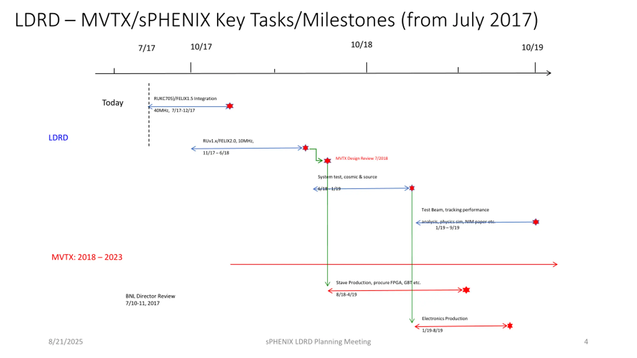 LDRD MVTX/sPHENIX Key Tasks/Milestones (from July 2017) 10/18 10/17 10/19 7/17 RUKC705)/FELIX1.5 Integration Today 40MHz, 7/17-12/17 LDRD RUv1.x/FELIX2.0, 10MHz, 11/17 6/18 MVTX Design Review 7/2018 System test, cosmic & source 6/18 - 1/19 Test Beam, tracking performance analysis, physics sim, NIM paper etc. 1/19 9/19 MVTX: 2018 2023 Stave Production, procure FPGA, GBT etc. 8/18-4/19 BNL Director Review 7/10-11, 2017 Electronics Production 1/19-8/19 8/21/2025 sPHENIX LDRD Planning Meeting 4