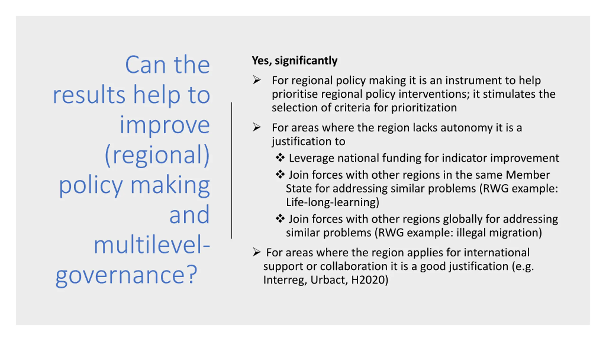 Can the Yes, significantly For regional policy making it is an instrument to help prioritise regional policy interventions; it stimulates the selection of criteria for prioritization For areas where the region lacks autonomy it is a justification to Leverage national funding for indicator improvement Join forces with other regions in the same Member State for addressing similar problems (RWG example: Life-long-learning) Join forces with other regions globally for addressing similar problems (RWG example: illegal migration) For areas where the region applies for international support or collaboration it is a good justification (e.g. Interreg, Urbact, H2020) results help to improve (regional) policy making and multilevel- governance?