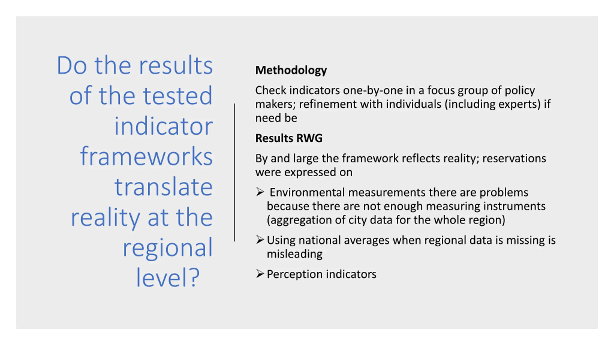 Do the results of the tested indicator frameworks translate reality at the regional level? Methodology Check indicators one-by-one in a focus group of policy makers; refinement with individuals (including experts) if need be Results RWG By and large the framework reflects reality; reservations were expressed on Environmental measurements there are problems because there are not enough measuring instruments (aggregation of city data for the whole region) Using national averages when regional data is missing is misleading Perception indicators